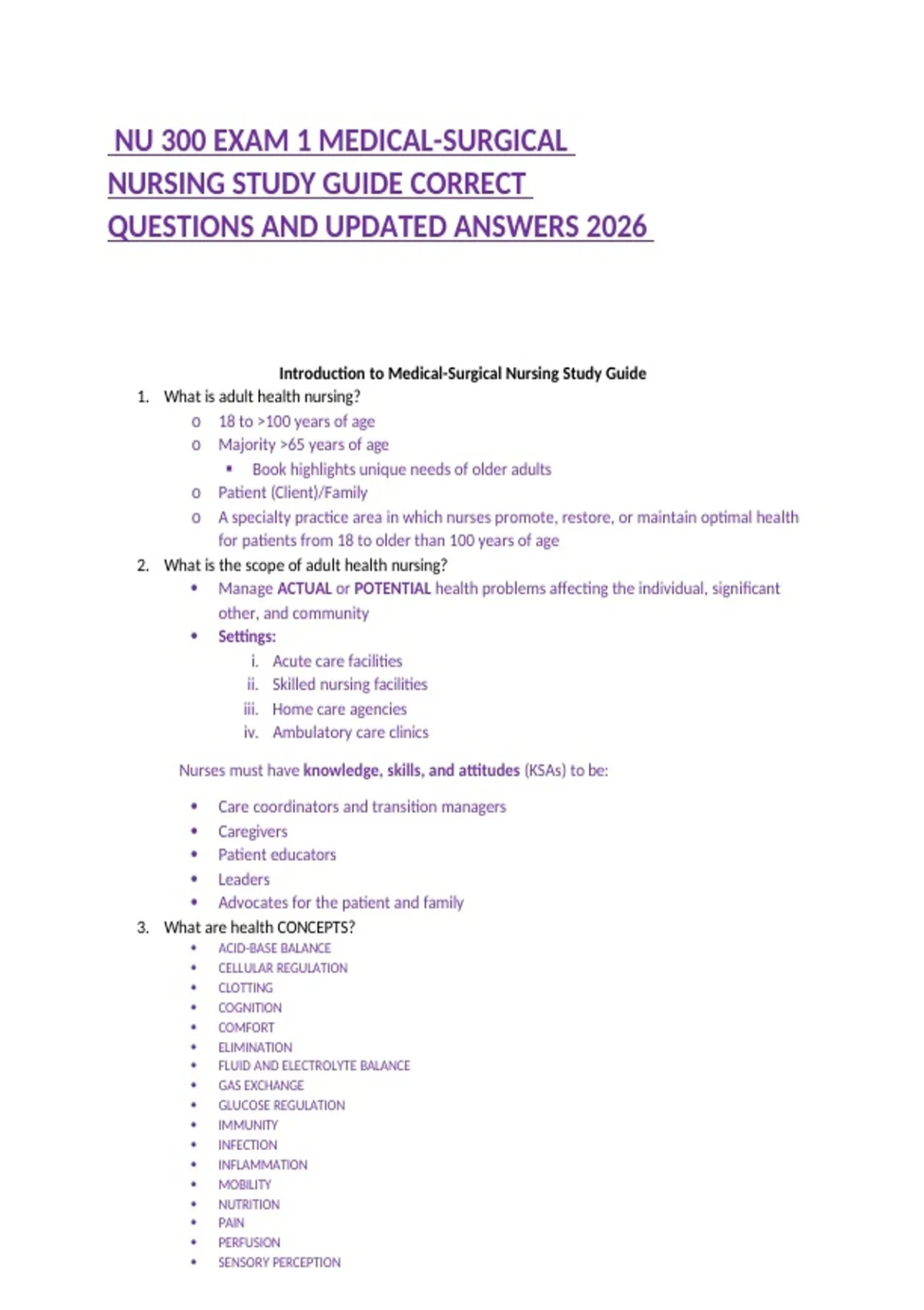NU 300 EXAM 1 MEDICAL-SURGICAL NURSING STUDY GUIDE CORRECT QUESTIONS AND UPDATED ANSWERS 2026