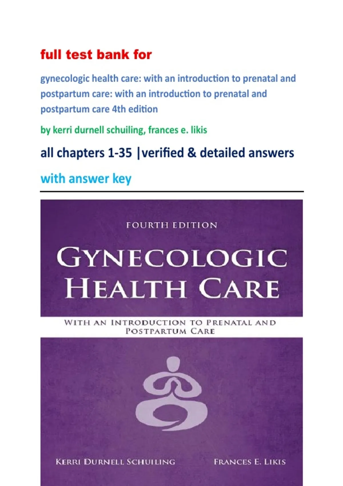 full test bank for gynecologic health care: with an introduction to prenatal and postpartum care: with an introduction to prenatal and postpartum care 4th edition by kerri durnell schuiling, frances e. likis all chapters 1-35 |verified & detailed answers with answer key