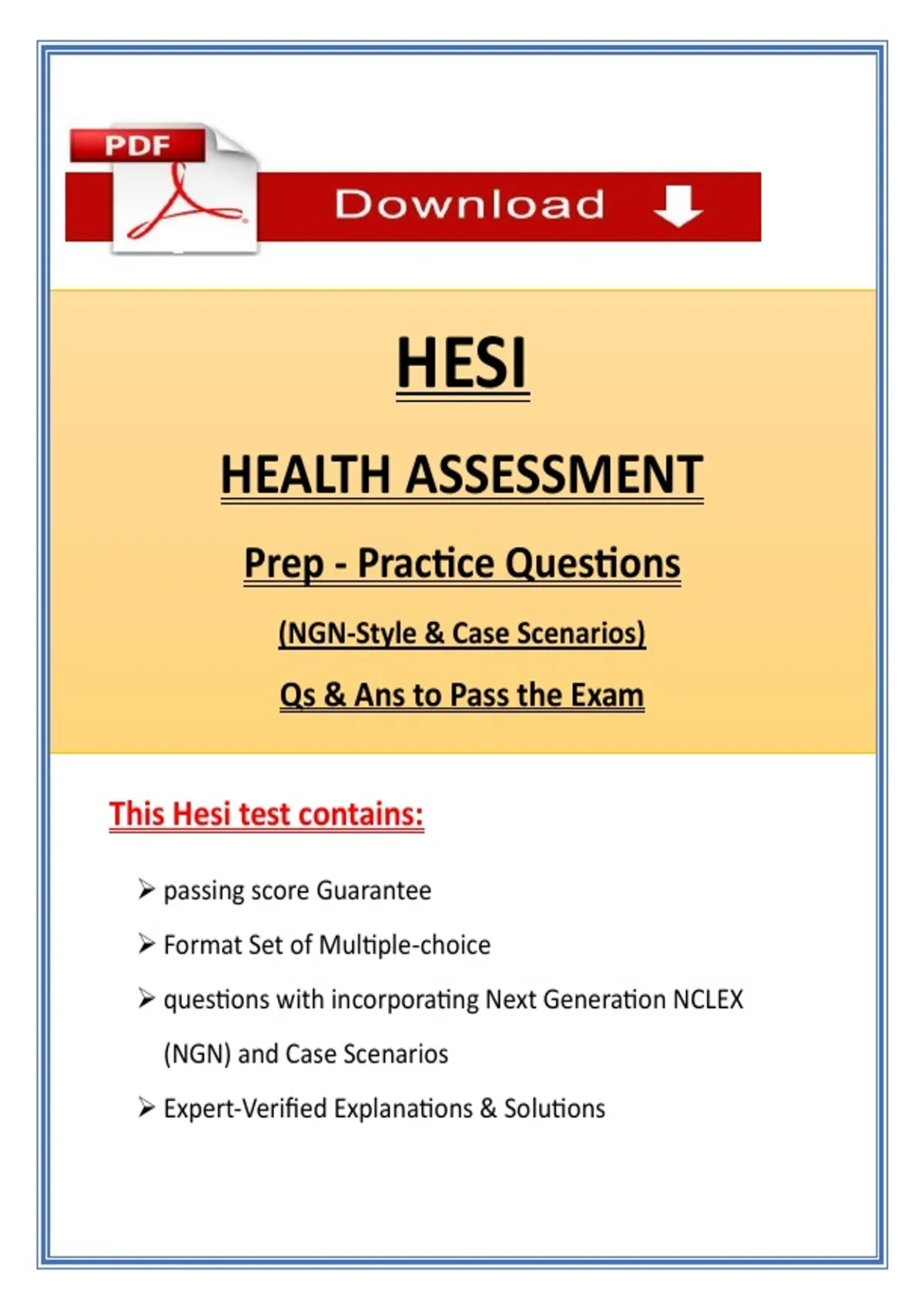 HESI Health Assessment Prep 2026 Practice Questions | NGN-Style & Case Scenarios | Actual Questions & Rationalized Answers Prepare effectively for your HESI Health Assessment exam with this NGN-style Practice Questions PDF, featuring case-based scenarios designed to simulate real exam conditions. This study guide includes hundreds of practice questions with verified answers, expert explanations, and coverage of all key health assessment topics such as physical assessment, vital signs, patient history, inspection, palpation, percussion, auscultation, clinical reasoning, and documentation. HESI Health Assessment NGN-style practice questions Case scenario-based questions for realistic practice Verified answers with expert explanations Covers all essential Health Assessment concepts Instant PDF download – start studying immediately Printable and mobile-friendly format HESI Health Assessment Prep NGN-style HESI practice questions HESI case scenario questions HESI exam practice PDF Nursing HESI study guide Physical assessment practice questions Vital signs and patient history test prep Clinical reasoning HESI questions Inspection palpation percussion auscultation questions Printable HESI Health Assessment PDF Verified HESI answers NGN clinical decision-making practice HESI Health Assessment review guide Nursing assessment case scenarios HESI exam success guide