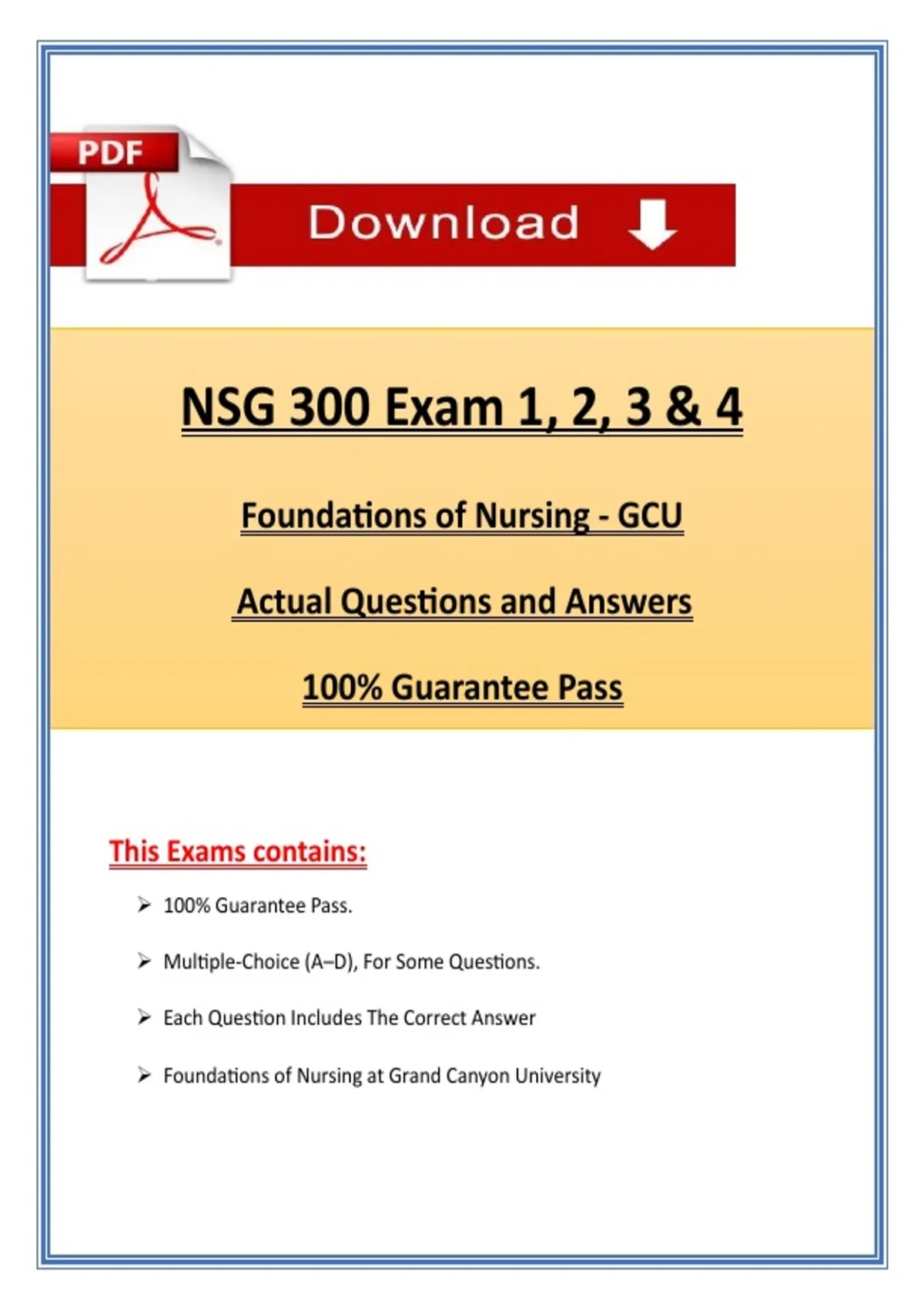 NSG 300 Exam (1, 2, 3 & 4) – Foundations of Nursing | Latest 2026 / 2027 | Actual Questions & Rationalized Answers – GCU Master NSG 300 – Foundations of Nursing at Grand Canyon University (GCU) with this complete Exam Bundle, including Exams 1, 2, 3, and 4. This Instant PDF Download is designed for nursing students seeking thorough preparation across all foundational nursing concepts. This bundle features exam-style questions with verified answers, detailed explanations, and comprehensive coverage of topics including patient safety, infection control, nursing process, health promotion, therapeutic communication, documentation, pharmacology basics, and clinical reasoning. NSG 300 Exams 1, 2, 3 & 4 questions & verified answers Expert explanations for each question Covers all core Foundations of Nursing topics Instant PDF download – study immediately Printable and mobile-friendly format NSG 300 Exams 1–4 Foundations of Nursing GCU Grand Canyon University nursing exams NSG 300 practice questions Nursing fundamentals study guide Patient safety exam prep Infection control nursing questions Nursing process test prep Health promotion and education exam Therapeutic communication practice Documentation nursing exam Printable NSG 300 PDF Clinical reasoning exam questions Nursing pharmacology basics NSG 300 verified answers guide