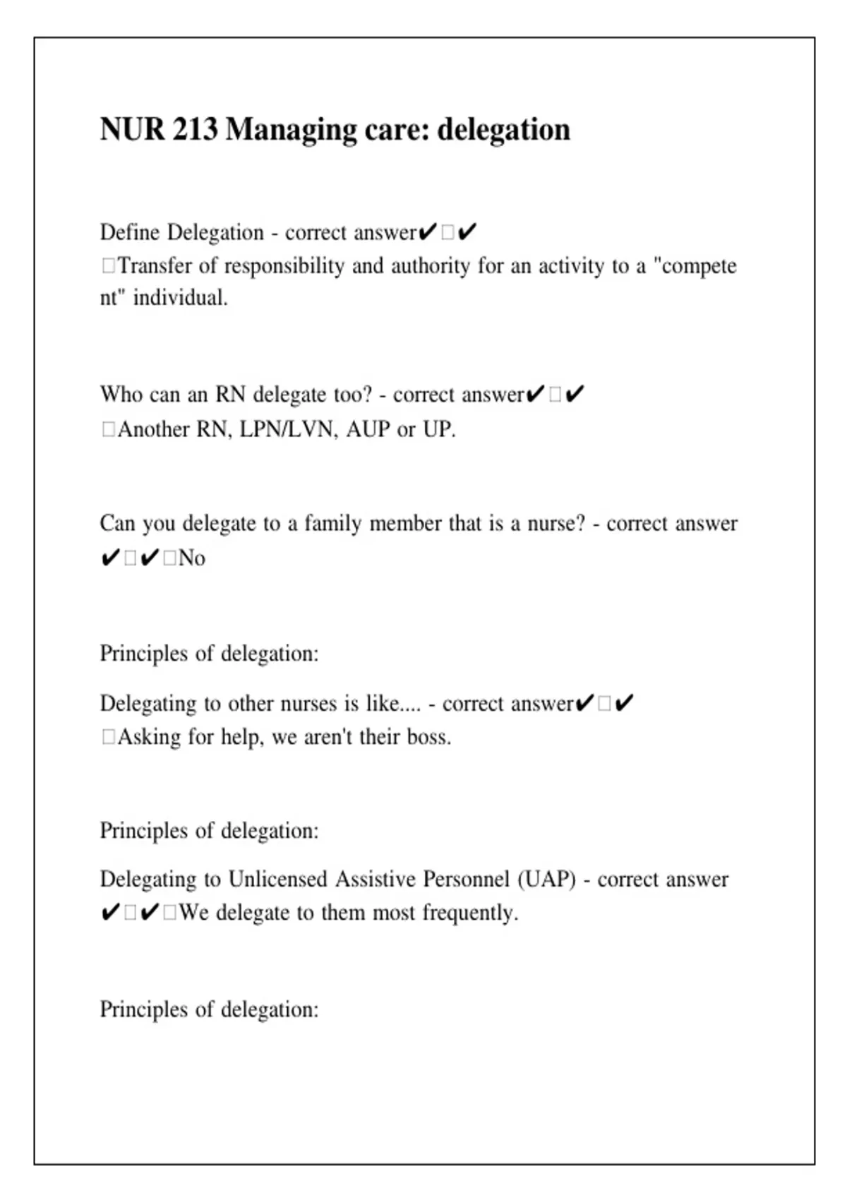 NUR 213 Managing care: delegation Exam and Already Passed Answers Set.