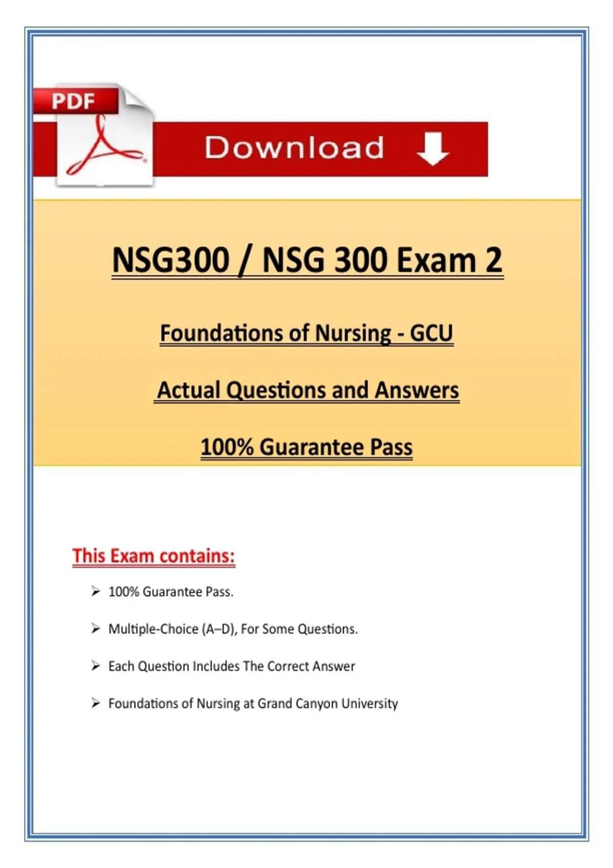 NSG 300 Exam 2 – Foundations of Nursing (Latest 2026 / 2027) – Actual Questions & Rationalized Answers – GCU Prepare confidently for NSG 300 Exam 2 – Foundations of Nursing at Grand Canyon University (GCU) with this Instant PDF Download, designed for nursing students seeking reliable exam preparation. This study guide includes exam-style questions with verified answers, expert explanations, and coverage of essential nursing concepts such as patient safety, infection control, the nursing process, therapeutic communication, health promotion, documentation, and foundational clinical reasoning skills, focusing on topics emphasized in Exam 2. NSG 300 Exam 2 questions & verified answers Expert explanations for every question Covers all key Foundations of Nursing concepts for Exam 2 Instant PDF download – study immediately Printable and mobile-friendly format NSG 300 Exam 2 Foundations of Nursing exam GCU Grand Canyon University nursing exam NSG 300 practice questions Nursing fundamentals study guide Patient safety exam prep Infection control nursing questions Nursing process test prep Therapeutic communication exam Health promotion practice questions Documentation nursing exam Printable NSG 300 PDF Clinical reasoning exam questions Nursing basic concepts review NSG 300 verified answers guide