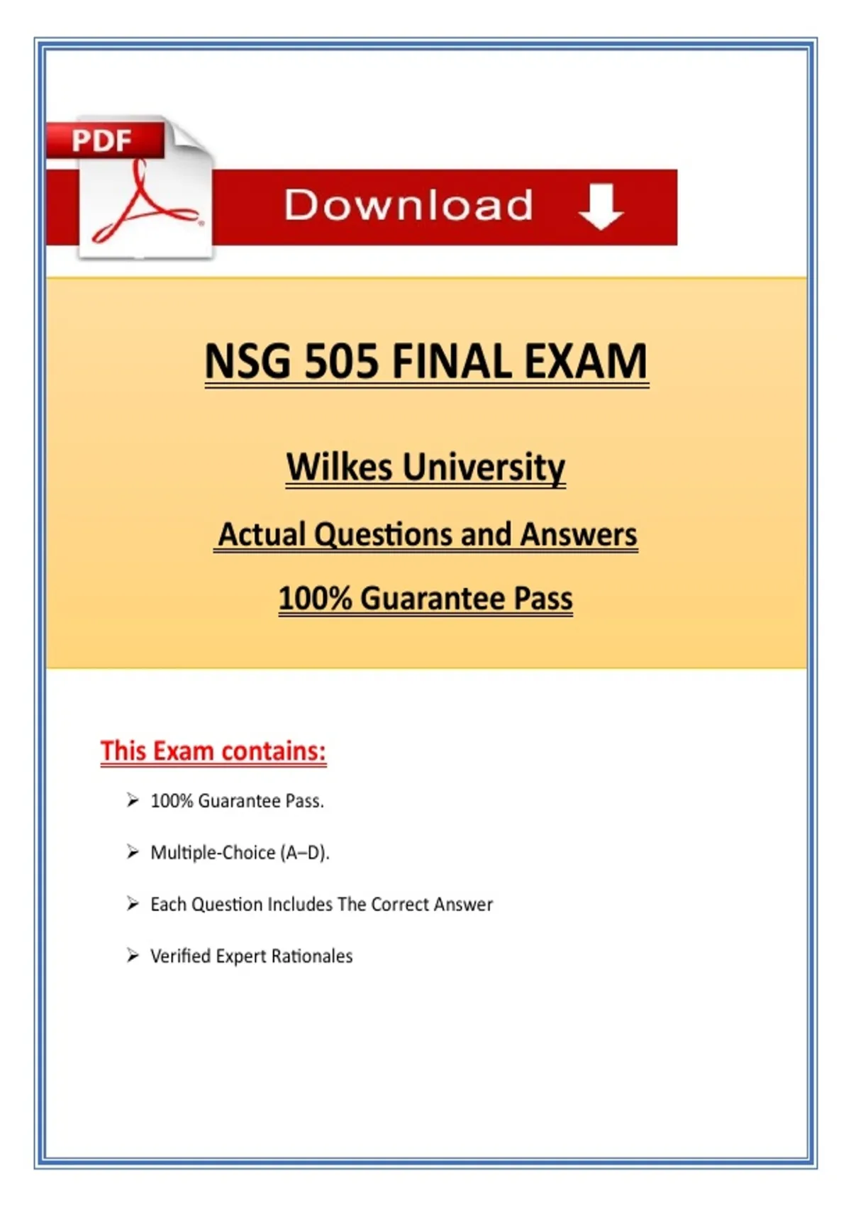 NSG 505 Final Exam (Latest 2026 / 2027) – Actual Questions & Rationalized Answers – Wilkes Prepare confidently for the NSG 505 Final Exam at Wilkes University with this Instant PDF Download, designed for nursing students seeking comprehensive exam preparation. This study guide includes exam-style questions with verified answers, detailed explanations, and coverage of essential advanced nursing concepts such as patient care management, clinical reasoning, pharmacology, pathophysiology, health assessment, evidence-based practice, and nursing interventions. NSG 505 Final Exam questions & verified answers Expert explanations for each question Covers all major topics included in the final exam Instant PDF download – start studying immediately Printable and mobile-friendly format NSG 505 Final Exam Wilkes University nursing exam NSG 505 practice questions Nursing final exam study guide Advanced nursing exam prep Patient care management questions Clinical reasoning exam prep Pharmacology practice questions Pathophysiology exam review Health assessment nursing test Evidence-based practice questions Printable NSG 505 PDF Nursing interventions exam prep Wilkes University NSG 505 review guide Verified nursing exam answers