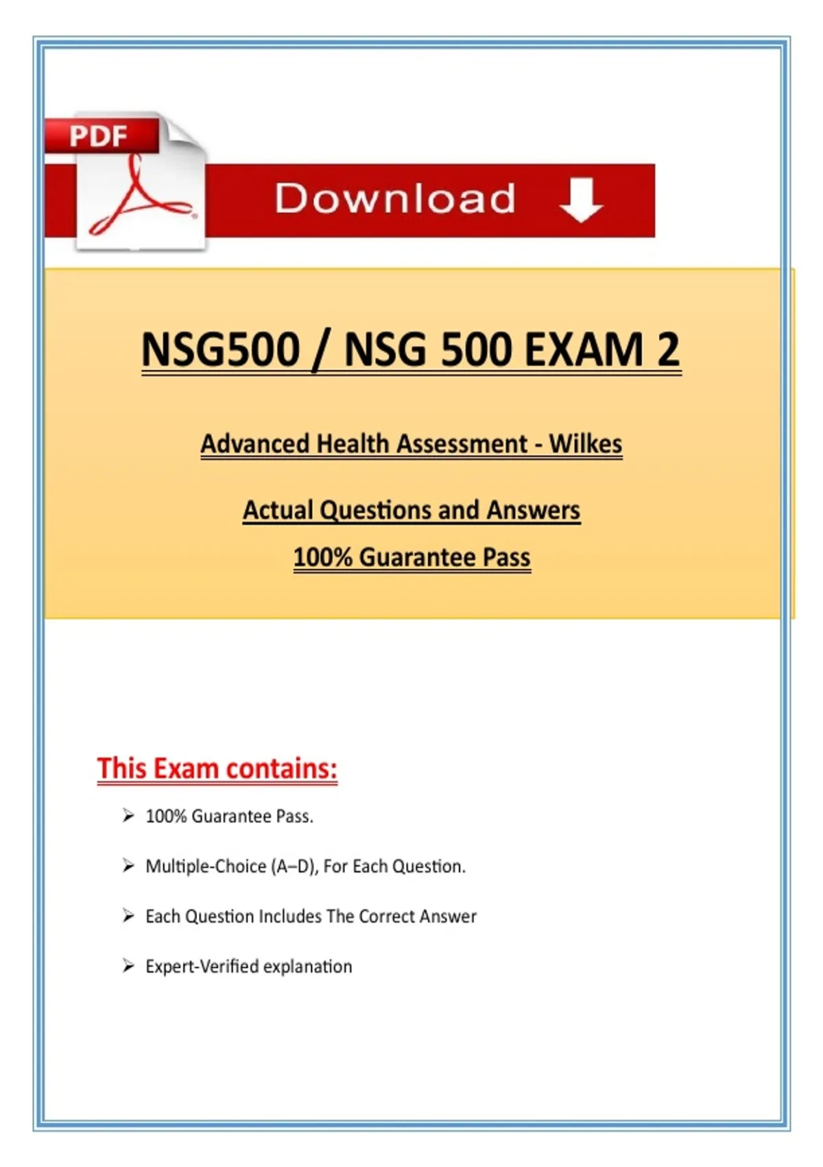 NSG 500 / NSG 500 Exam 2 (Latest 2026 / 2027) Actual Questions & Answers Advanced Health Assessment - Wilkes Prepare confidently for NSG 500 Exam 2 – Advanced Health Assessment at Wilkes University with this Instant PDF Download, designed for nursing students seeking comprehensive exam preparation. This study guide includes exam-style questions with verified answers, detailed explanations, and coverage of key advanced health assessment topics such as head-to-toe physical assessment, cardiovascular, respiratory, neurological, gastrointestinal, and musculoskeletal evaluations, diagnostic reasoning, and documentation. NSG 500 Exam 2 questions & verified answers Expert explanations for every question Covers all essential Advanced Health Assessment concepts for Exam 2 Instant PDF download – start studying immediately Printable and mobile-friendly format NSG 500 Exam 2 Advanced Health Assessment Wilkes Wilkes University nursing exam NSG 500 practice questions Head-to-toe physical assessment exam Cardiovascular assessment questions Respiratory assessment test prep Neurological evaluation practice Gastrointestinal assessment exam Musculoskeletal assessment questions Diagnostic reasoning nursing exam Printable NSG 500 PDF Advanced Health Assessment review guide Nursing assessment case scenarios Verified NSG 500 exam answers