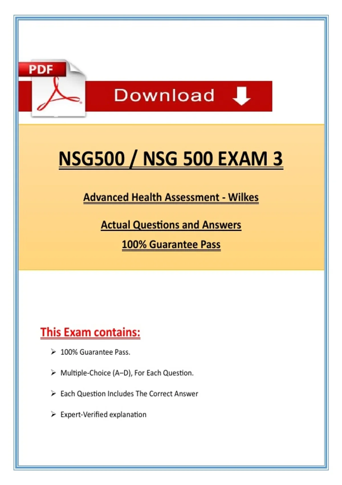NSG 500 / NSG 500 Exam 3 (Latest 2026 / 2027) Actual Questions & Answers Advanced Health Assessment - Wilkes Prepare confidently for NSG 500 Exam 3 – Advanced Health Assessment at Wilkes University with this Instant PDF Download, designed for nursing students seeking comprehensive exam preparation. This study guide includes exam-style questions with verified answers, detailed explanations, and coverage of advanced health assessment topics such as neurological, cardiovascular, respiratory, gastrointestinal, musculoskeletal, and integumentary system assessments, diagnostic reasoning, and documentation best practices. NSG 500 Exam 3 questions & verified answers Expert explanations for every question Covers all essential Advanced Health Assessment concepts for Exam 3 Instant PDF download – start studying immediately Printable and mobile-friendly format NSG 500 Exam 3 Advanced Health Assessment Wilkes Wilkes University nursing exam NSG 500 practice questions Neurological assessment exam prep Cardiovascular evaluation questions Respiratory system exam practice Gastrointestinal assessment test Musculoskeletal evaluation questions Integumentary system assessment Diagnostic reasoning nursing exam Printable NSG 500 PDF Advanced Health Assessment review guide Nursing assessment case scenarios Verified NSG 500 exam answers