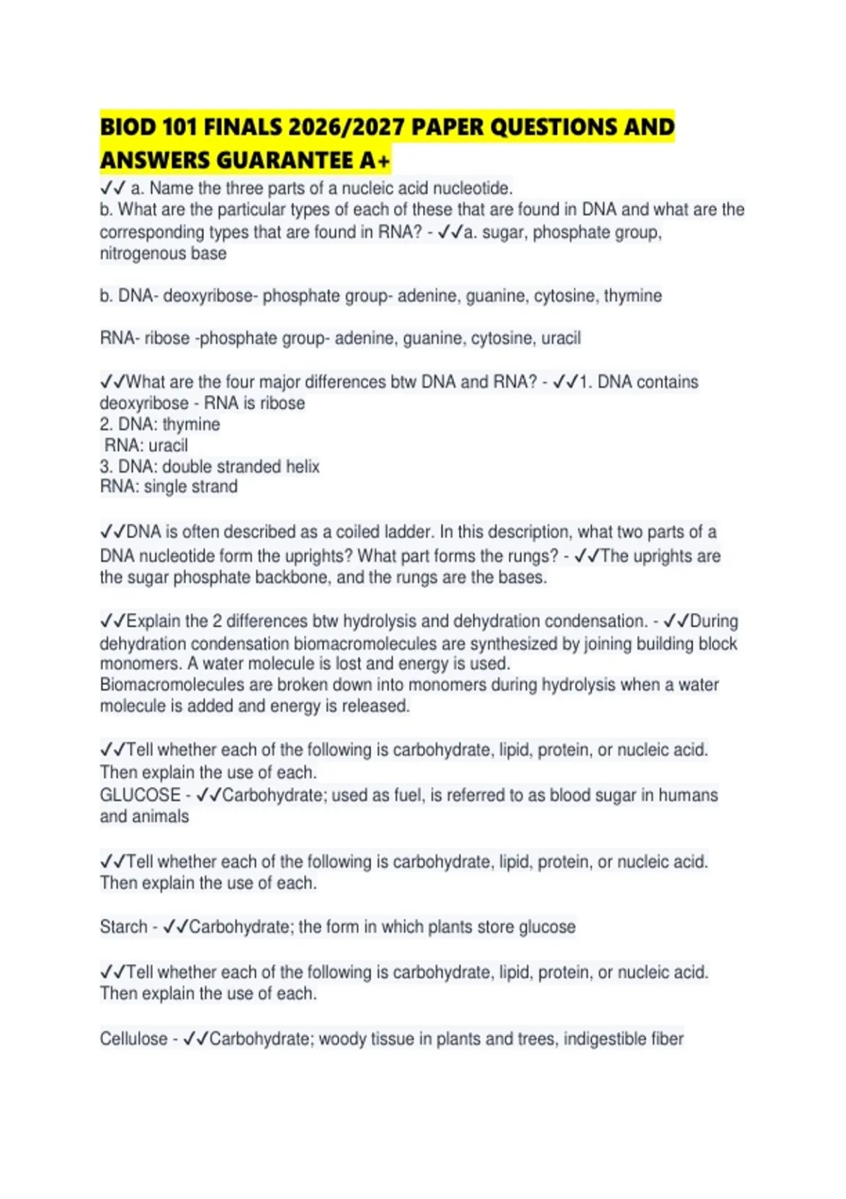 BIOD 101 FINALS 2026/2027 PAPER QUESTIONS AND ANSWERS GUARANTEE A+
