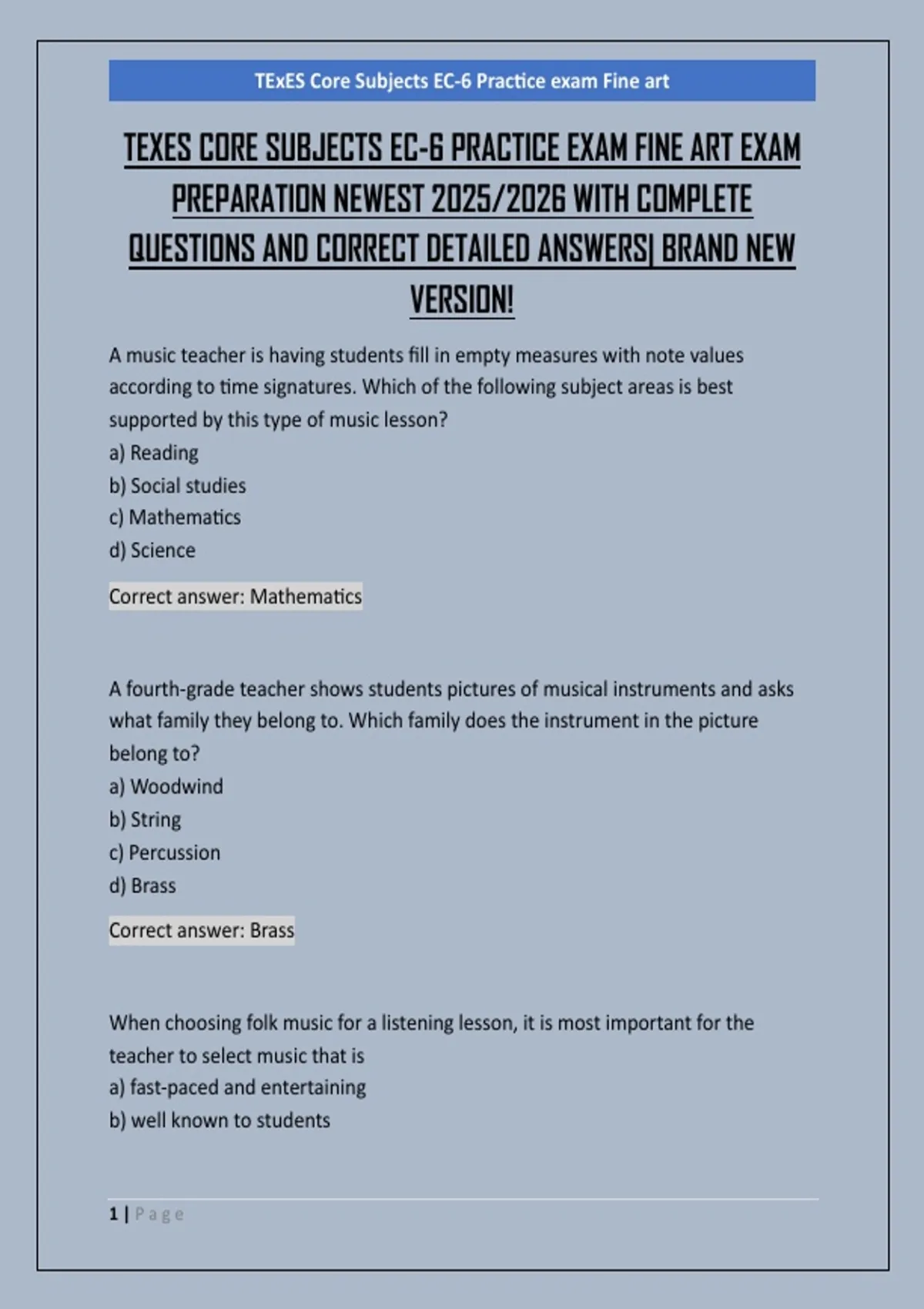 TEXES CORE SUBJECTS EC-6 PRACTICE EXAM FINE ART EXAM PREPARATION NEWEST 2025/2026 WITH COMPLETE QUESTIONS AND CORRECT DETAILED ANSWERS| BRAND NEW VERSION!