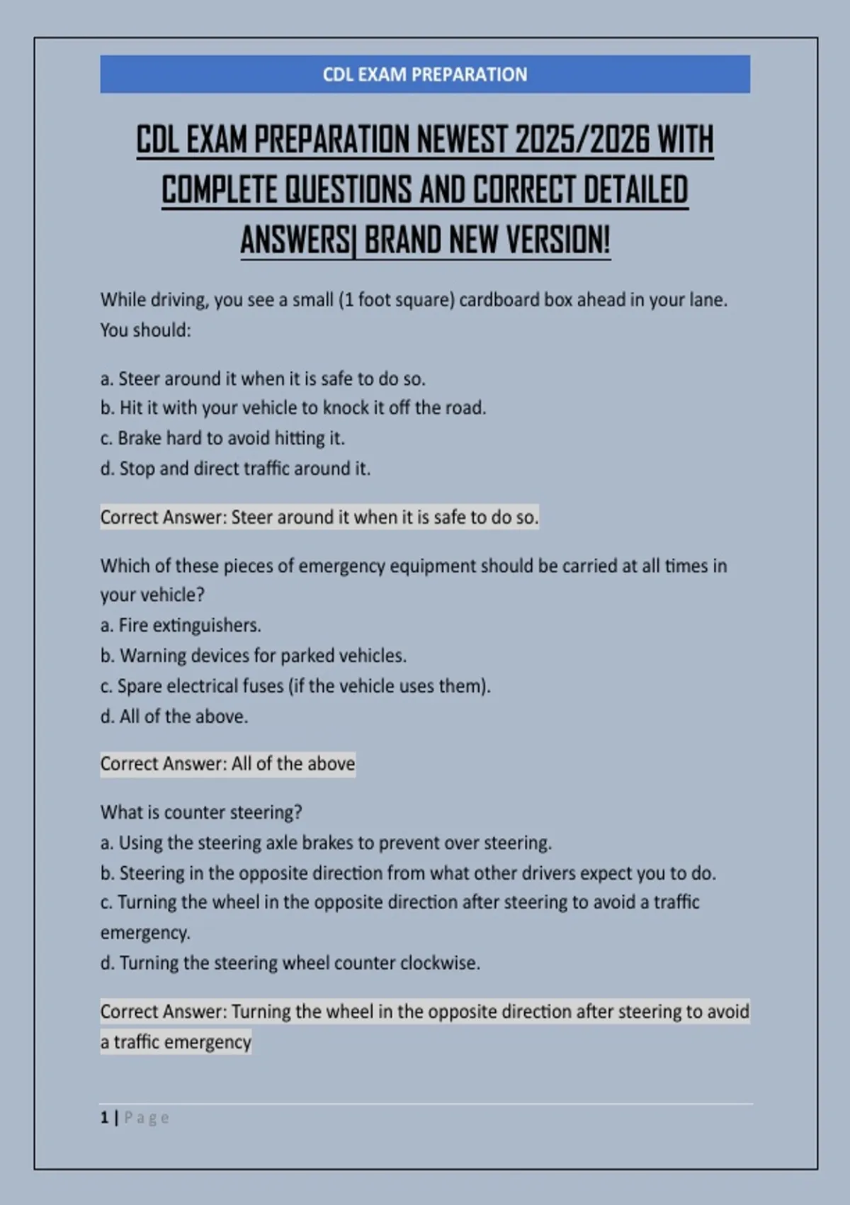 CDL EXAM PREPARATION NEWEST 2025/2026 WITH COMPLETE QUESTIONS AND CORRECT DETAILED ANSWERS| BRAND NEW VERSION!
