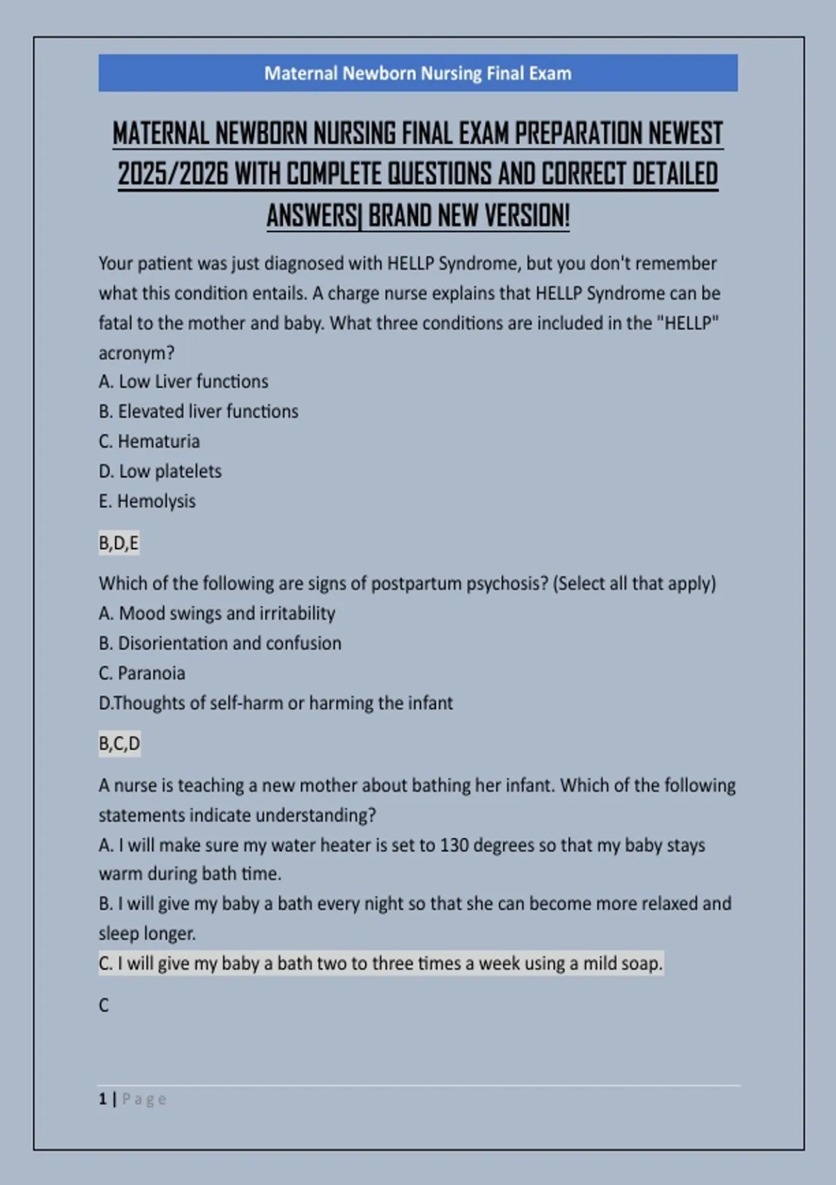MATERNAL NEWBORN NURSING FINAL EXAM PREPARATION NEWEST