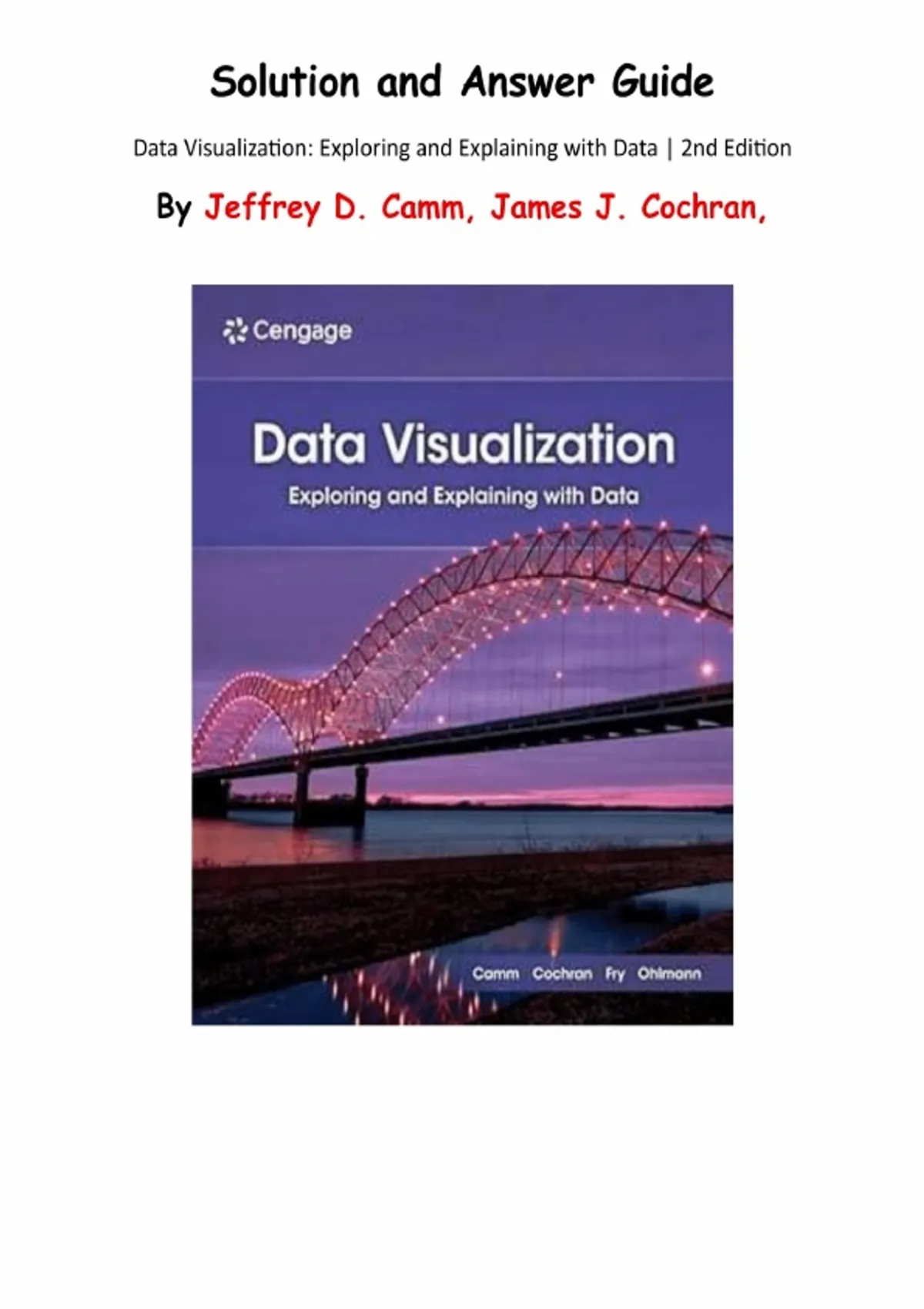 This document provides the complete solutions manual for Data Visualization: Exploring and Explaining with Data (2nd Edition) by Jeffrey D. Camm. It includes detailed, step-by-step solutions for Chapters 1 through 9, covering data visualization principles, graphical integrity, exploratory and explanatory graphics, dashboards, and effective communication with data. The material supports coursework, homework completion, and deeper understanding of data-driven storytelling and analysis.