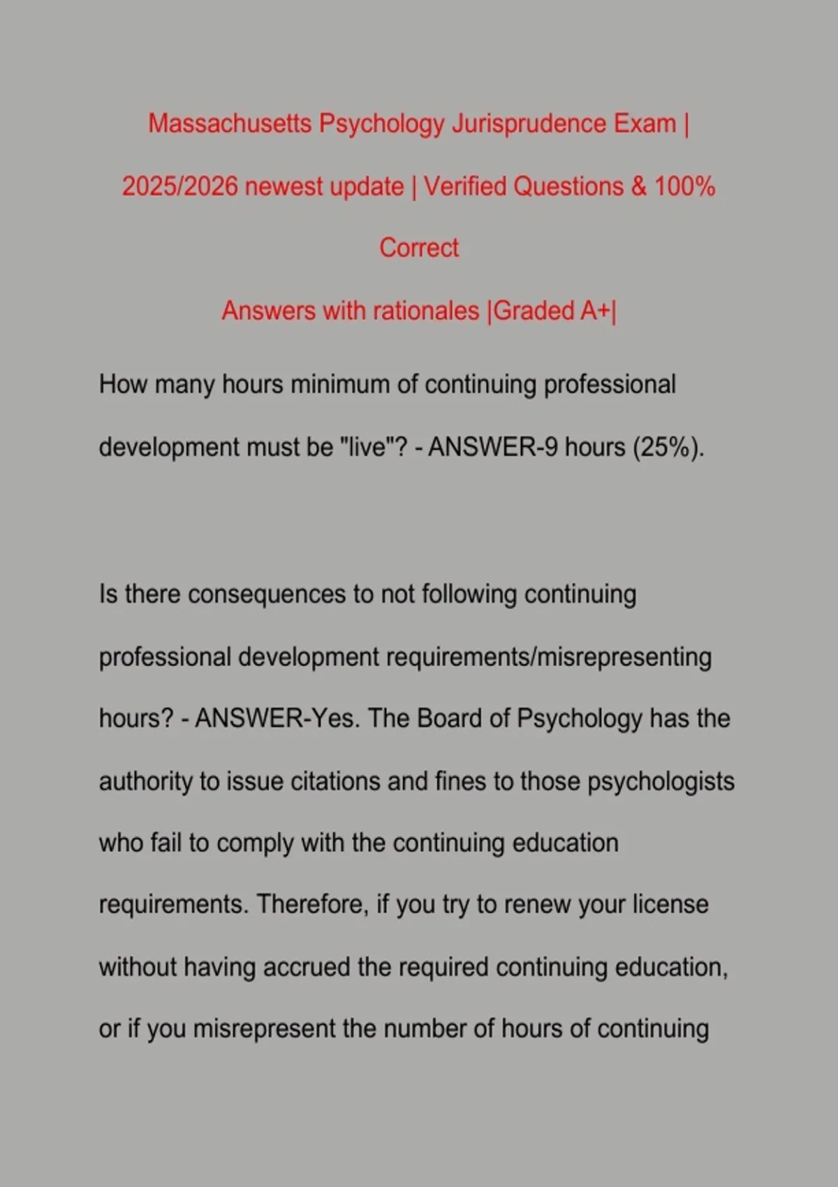 This document contains the newest 2025–2026 updated preparation material for the Massachusetts Psychology Jurisprudence Exam. It includes carefully verified exam-style questions with 100% correct answers and clear rationales covering Massachusetts laws, ethical standards, licensure requirements, scope of practice, and professional responsibilities needed to pass with confidence.