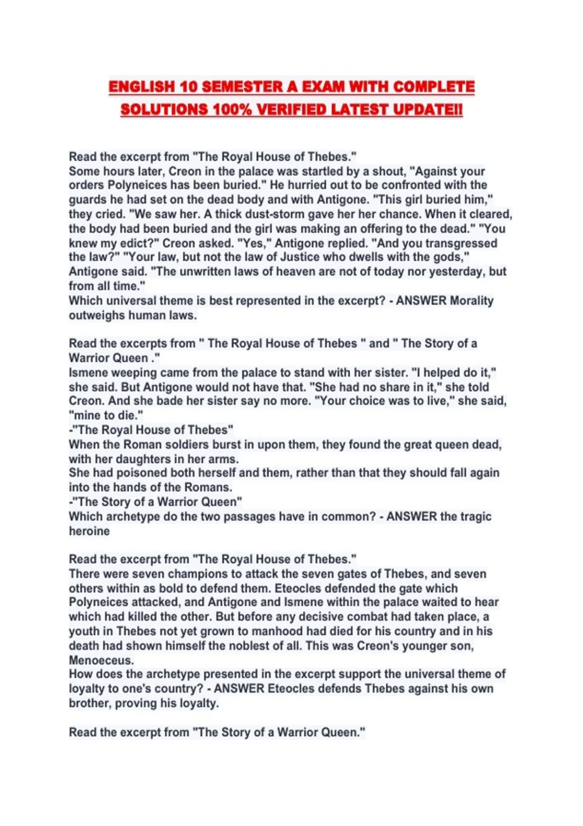 ENGLISH 10 – Semester A Exam Latest 2026–2027 Update | Complete Exam Questions & Correct Answers | Reading, Writing, Grammar & Vocabulary | ️ Grade A Guaranteed | High School English Final Exam PDF ⬇️