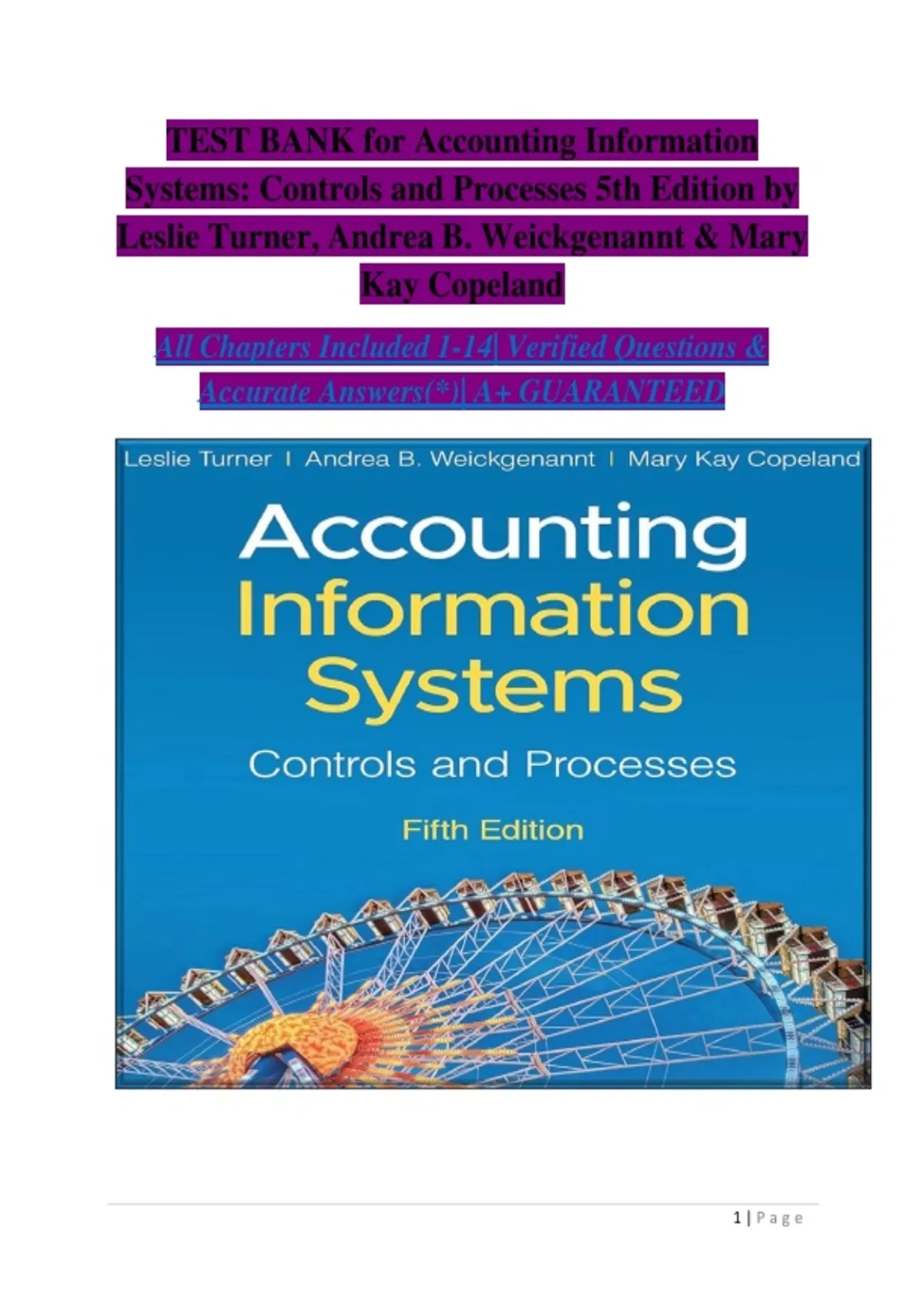 TEST BANK for Accounting Information Systems: Controls and Processes 5th Edition by Leslie Turner, Andrea B. Weickgenannt & Mary Kay Copeland All Chapters Included 1-14| Verified Questions & Accurate Answers(*)| A+ GUARANTEED