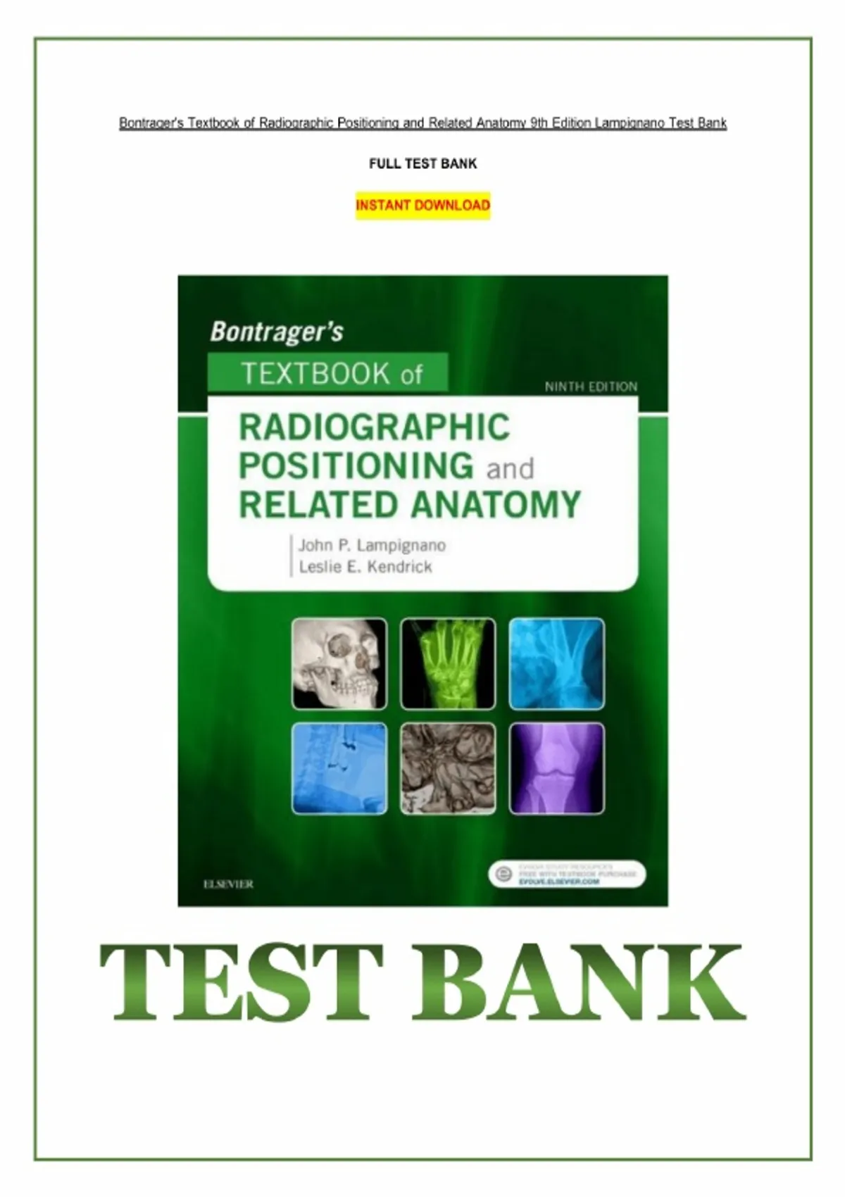 Test Bank for Bontrager’s Textbook of Radiographic Positioning and Related Anatomy 9th Edition John Lampignano, Leslie E. Kendrick 9780323399661 Chapter 1-20 Complete Guide. Contents: 1. Terminology, Imaging, and Positioning Principles 2. Chest 3. Abdomen 4. Upper Limb 5. Humerus and Shoulder Girdle 6. Lower Limb 7. Femur and Pelvic Girdle 8. Cervical and Thoracic Spine 9. Lumbar Spine, Sacrum, and Coccyx 10. Bony Thorax—Sternum and Ribs 11. Cranium, Facial Bones, and Paranasal Sinuses 12. Biliary Tract and Upper Gastrointestinal System 13. Lower Gastrointestinal System 14. Urinary System and Venipuncture 15. Trauma, Mobile, and Surgical Radiography 16. Pediatric Radiography 17. Angiography and Interventional Procedures 18. Computed Tomography 19. Special Radiographic Procedures 20. Diagnostic and Therapeutic Modalities