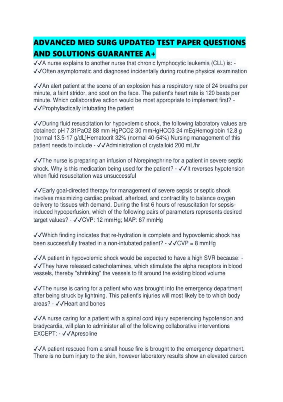 ADVANCED MED SURG UPDATED TEST PAPER QUESTIONS AND SOLUTIONS GUARANTEE