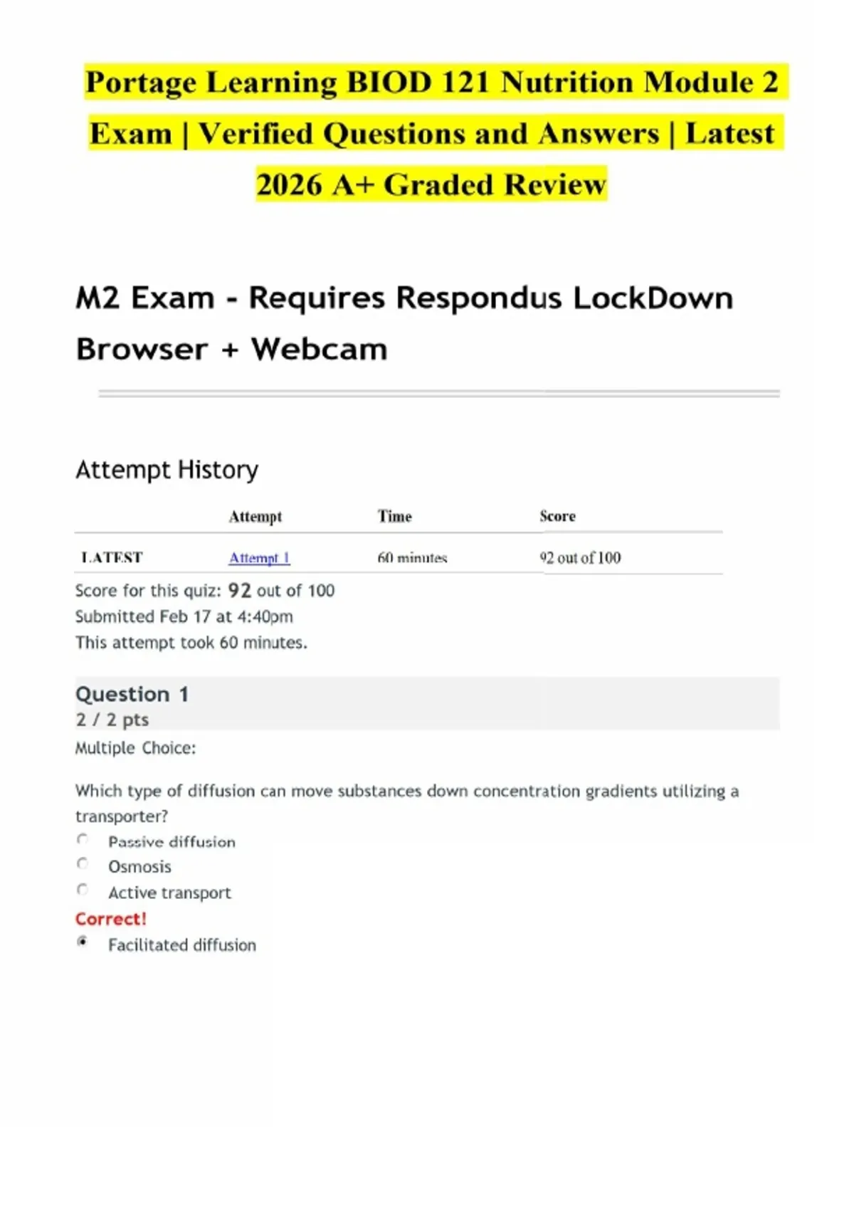 Pass your exam with confidence using these verified answers for the Portage Learning BIOD 121 Essentials in Nutrition Module 2 Exam. This comprehensive 2026 study resource covers all 29 questions, providing detailed solutions and rationales for core topics including gastrointestinal tract functions, types of diffusion (passive, facilitated, and active transport), and the role of accessory organs like the liver and pancreas. The guide features in-depth explanations on carbohydrate and protein digestion, blood sugar regulation via insulin and glucagon, and the identification of clinical conditions such as Kwashiorkor and Marasmus. Whether you are studying the ABCDEs of nutritional assessment or the chemical breakdown of macromolecules, this expert-reviewed exam prep ensures a deep understanding of the BIOD121 curriculum at Geneva College. Use this latest version to master complex nutritional physiology and secure an A+ on your Respondus LockDown Browser assessment.