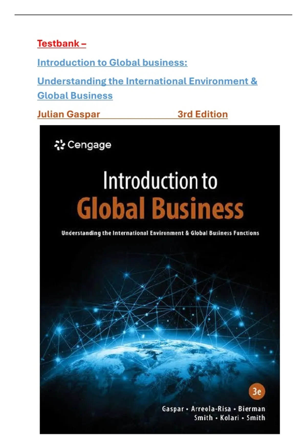 Test Bank for Introduction to Global Business: Understanding the International Environment & Global Business 3rd Edition by Julian Gaspar , All Chapters Included