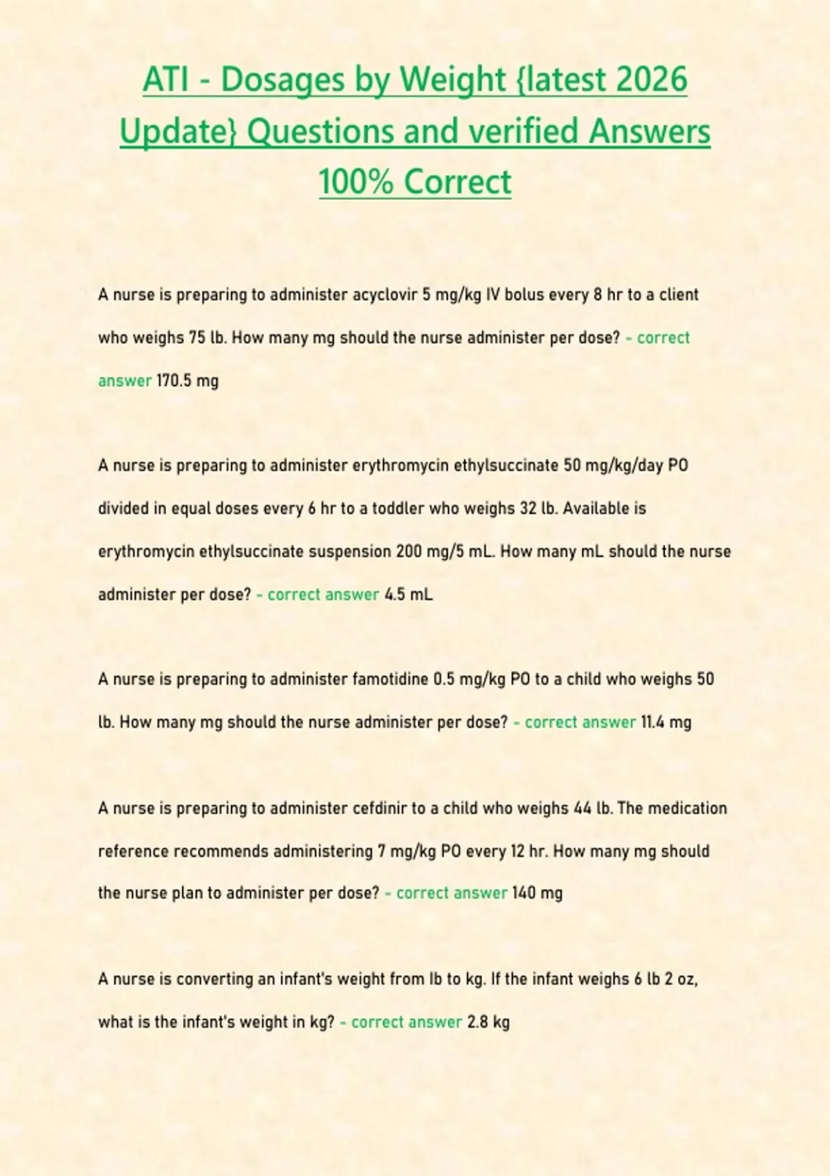 ATI - Dosages by Weight -latest 2026 Update- Questions and verified Answers 100- Correct