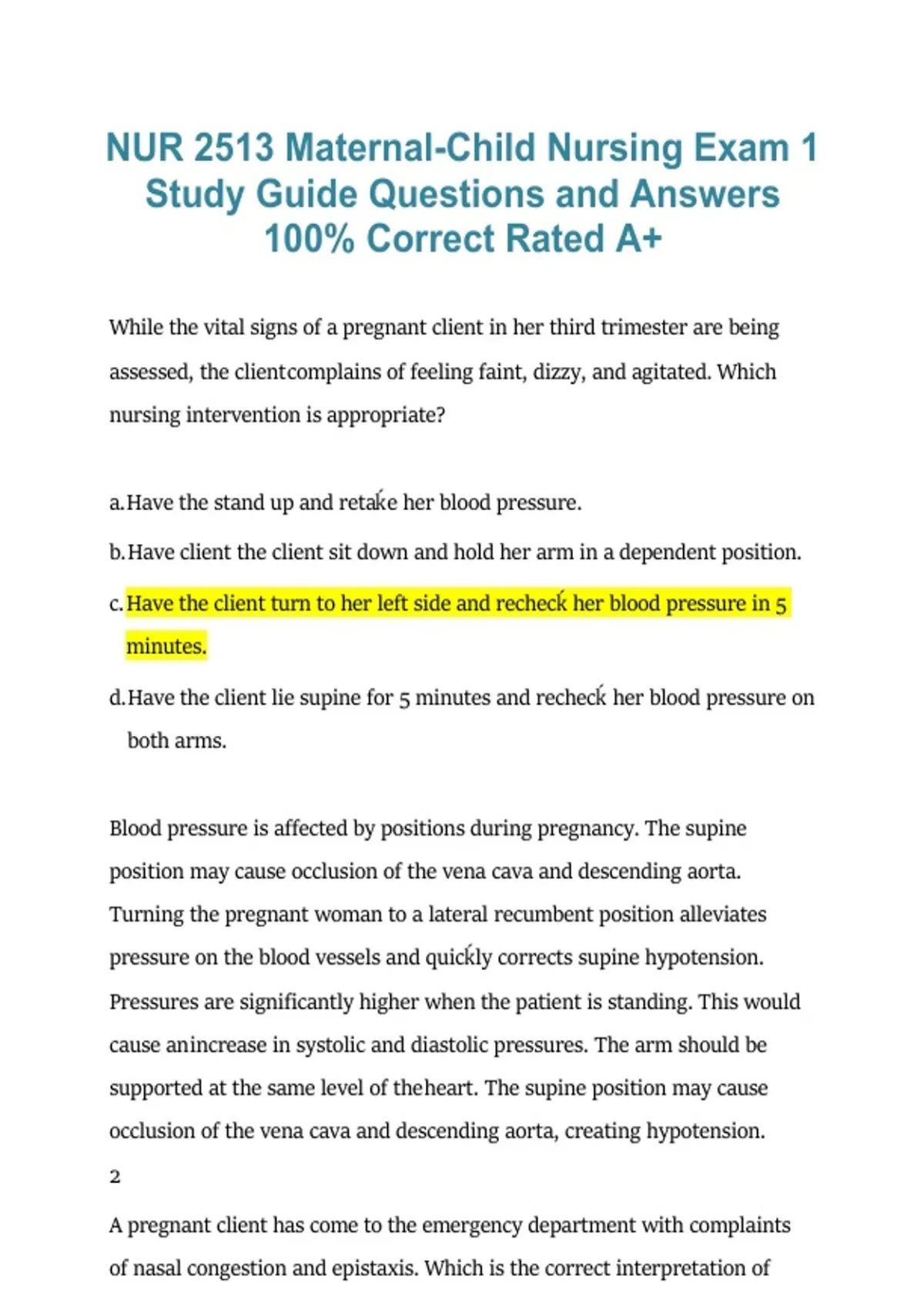 c. Have the client turn to her left side and rechecḱ her blood pressure in 5