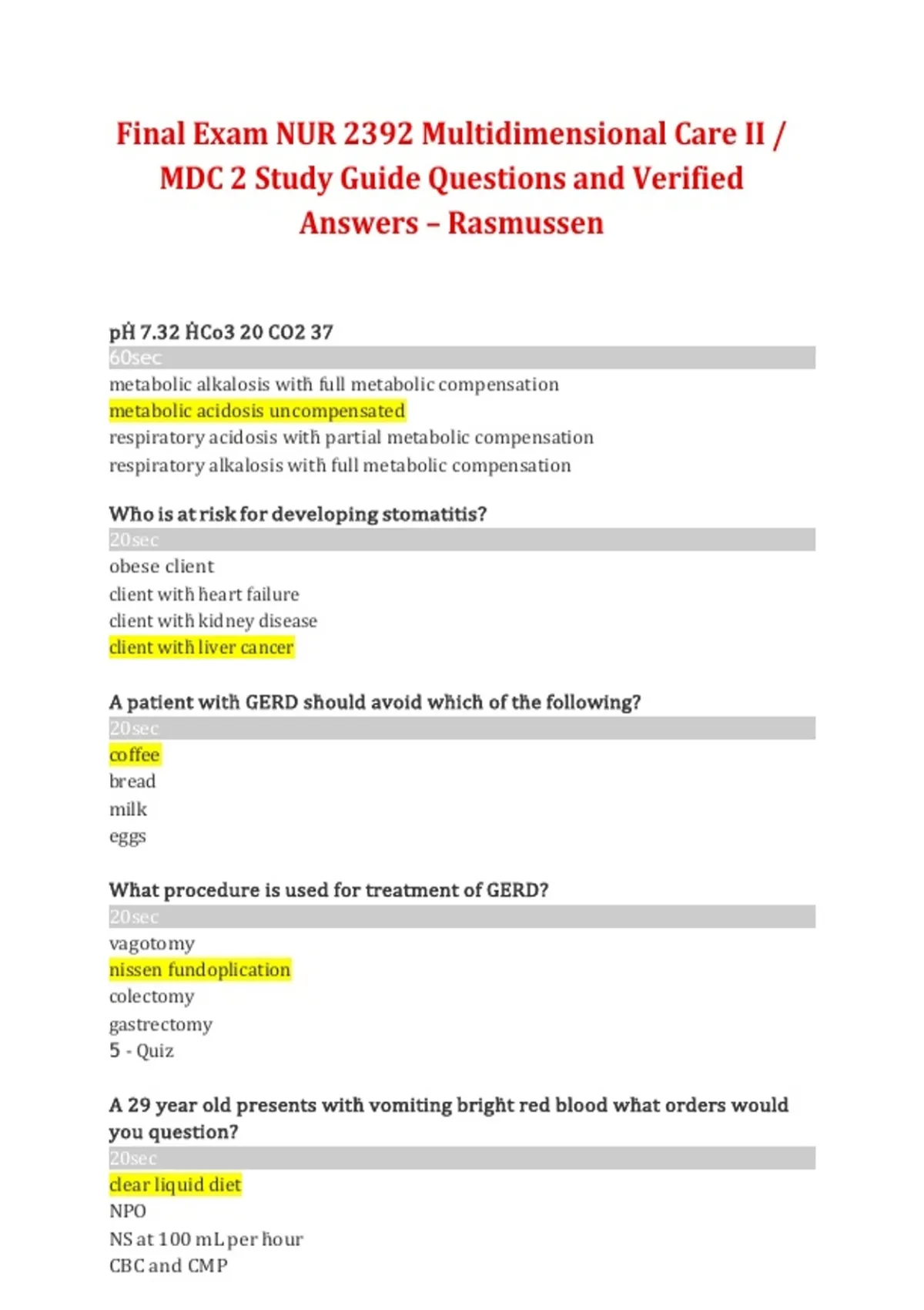 This study guide for the NUR 2392 Multidimensional Care II (MDC 2) final exam at Rasmussen includes exam-style questions with fully verified correct answers. It covers core concepts such as multidimensional patient care, clinical assessment, prioritization, intervention planning, and management of complex nursing cases, supporting thorough preparation for the 2026/2027 final exam