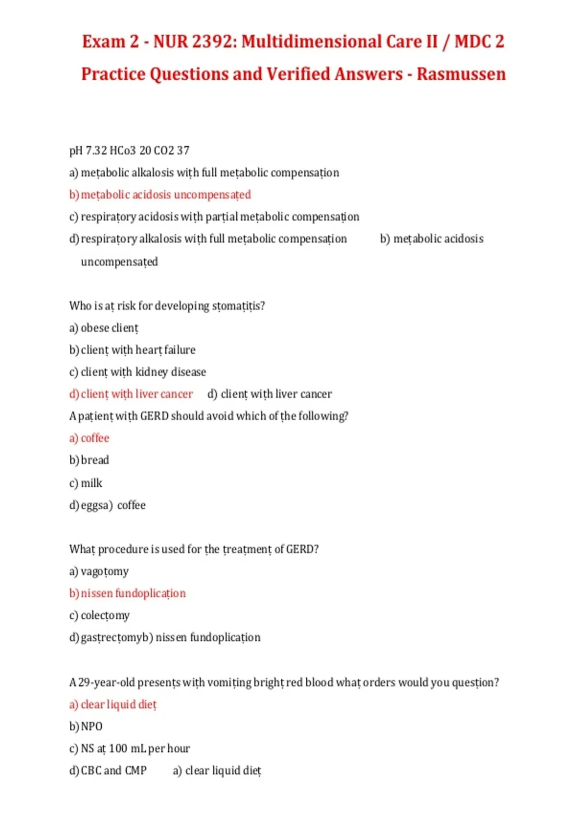 This practice guide for NUR 2392 Multidimensional Care II (MDC 2) Exam 2 at Rasmussen includes exam-style questions with fully verified correct answers. It focuses on multidimensional patient care, clinical assessment, intervention planning, prioritization, and management of complex nursing scenarios, providing a reliable tool for effective preparation for the 2026/2027 exam.