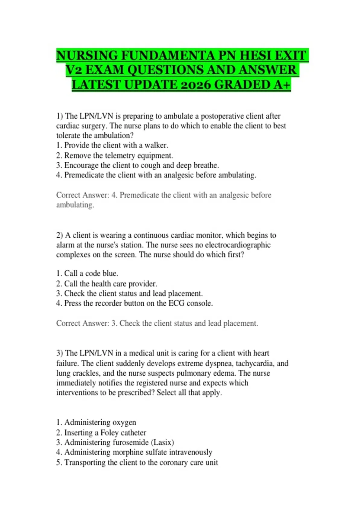 This test bank includes the latest 2026 update of Nursing Fundamentals PN HESI Exit Exam Questions and Answers (V2). It covers core nursing fundamentals topics such as patient care, safety, pharmacology, clinical skills, and professional practice, with graded A+ solutions designed to support exam preparation, reinforce clinical knowledge, and improve HESI exam performance