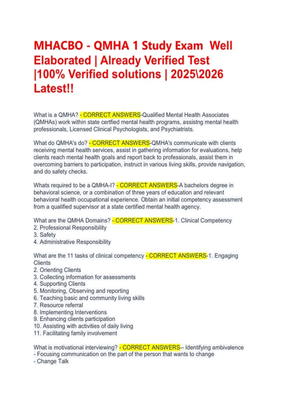 Ace the MHACBO QMHA 1 certification exam with our complete 2025/2026 study package. Access well-elaborated, already verified test questions and 100% verified solutions that mirror the latest exam blueprint. Boost your confidence and ensure success with our up-to-date practice materials and expert-crafted answers. Download your comprehensive study guide now!