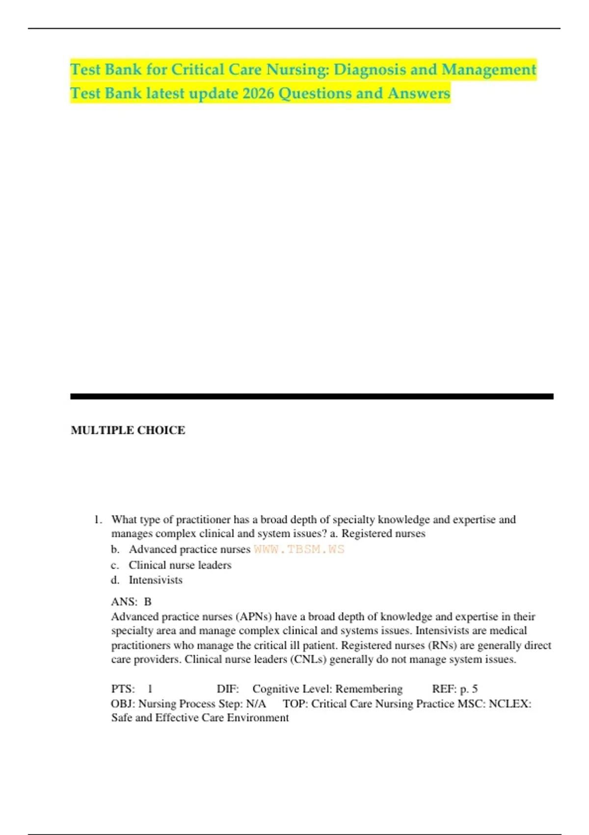 Test Bank for Critical Care Nursing: Diagnosis and Management