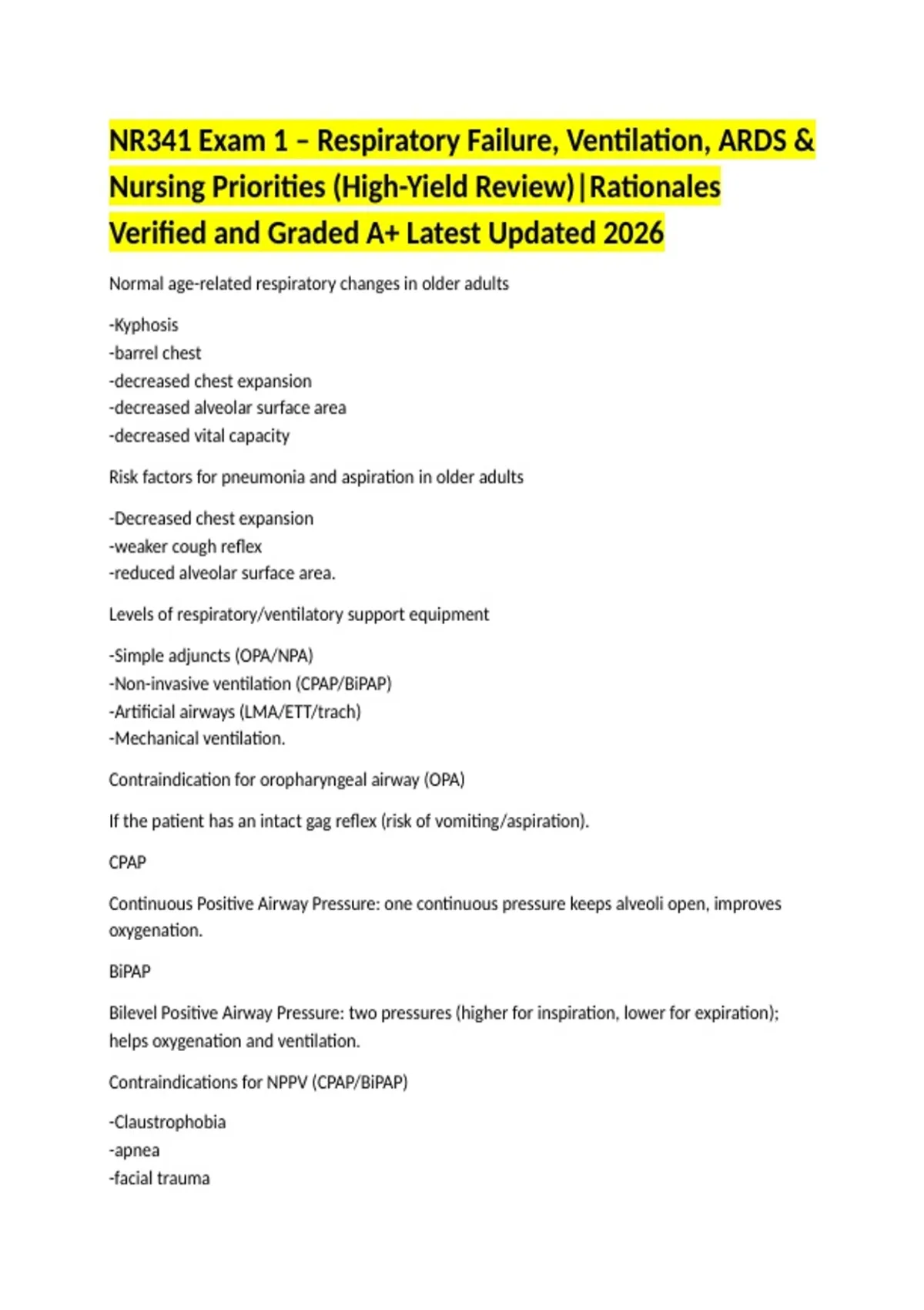 NR341 Exam 1 – Respiratory Failure, Ventilation, ARDS & Nursing Priorities (High-Yield Review)|Rationales Verified and Graded A+ Latest Updated 2026 Normal age-related respiratory changes in older adults -Kyphosis -barrel chest -decreased chest expansion -decreased alveolar surface area -decreased vital capacity Risk factors for pneumonia and aspiration in older adults -Decreased chest expansion -weaker cough reflex -reduced alveolar surface area. Levels of respiratory/ventilatory support equipment -Simple adjuncts (OPA/NPA) -Non-invasive ventilation (CPAP/BiPAP) -Artificial airways (LMA/ETT/trach) -Mechanical ventilation. Contraindication for oropharyngeal airway (OPA) If the patient has an intact gag reflex (risk of vomiting/aspiration). CPAP Continuous Positive Airway Pressure: one continuous pressure keeps alveoli open, improves oxygenation. BiPAP Bilevel Positive Airway Pressure: two pressures (higher for inspiration, lower for expiration); helps oxygenation and ventilation. Contraindications for NPPV (CPAP/BiPAP) -Claustrophobia -apnea -facial trauma -uncontrolled vomiting -inability to protect airway -neuromuscular disease. Endotracheal tube (ETT) vs tracheostomy ETT is for short-term airway management; tracheostomy is for long-term airway management. Main risk of mechanical ventilation Ventilator-associated pneumonia (VAP). FiOI Fraction of inspired oxygen: the percentage of oxygen the patient receives (21% = room air). PEEP Positive End-Expiratory Pressure: keeps alveoli open at end of exhalation, improves oxygenation in ARDS, prevents collapse. Risk of high PEEP Barotrauma (pneumothorax) and decreased cardiac output. High-pressure ventilator alarm Indicates obstruction: secretions, kinked tubing, patient biting tube, decreased lung compliance, coughing/fighting vent. Low-pressure ventilator alarm Indicates disconnection or leak: tubing disconnect, ET/trach cuff leak, ventilator malfunction, or apnea. First action when vent alarm sounds Check the patient first, then the ventilator. If unresolved, bag the patient. Ventilator-associated pneumonia (VAP) occurrence 48 hours or more after intubation. Best nursing interventions to prevent VAP HOB 30-45°, oral care q2h with chlorhexidine, suctioning, daily sedation vacations, hand hygiene. Hallmark sign of ARDS