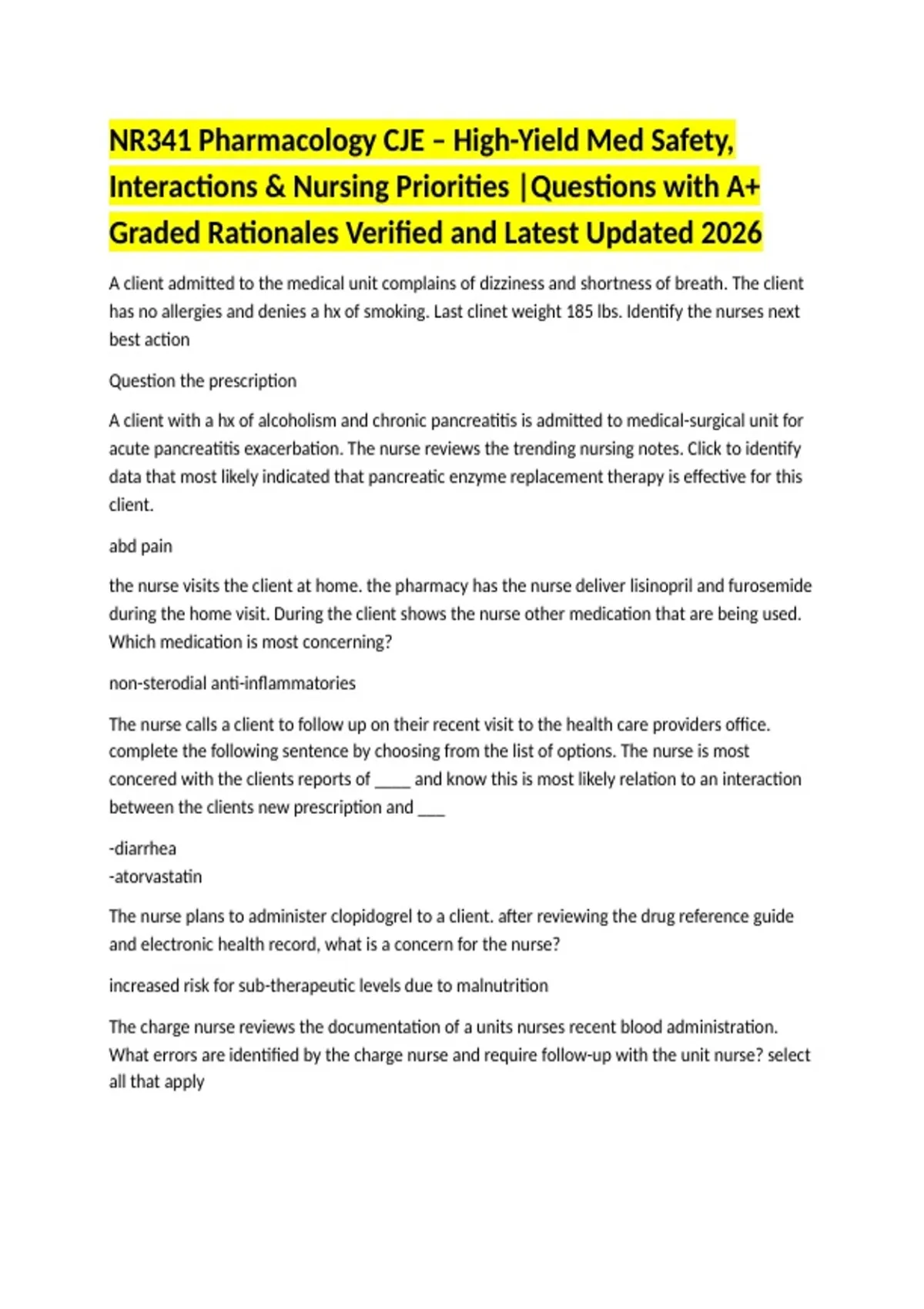 NR341 Pharmacology CJE – High-Yield Med Safety, Interactions & Nursing Priorities |Questions with A+ Graded Rationales Verified and Latest Updated 2026 A client admitted to the medical unit complains of dizziness and shortness of breath. The client has no allergies and denies a hx of smoking. Last clinet weight 185 lbs. Identify the nurses next best action Question the prescription A client with a hx of alcoholism and chronic pancreatitis is admitted to medical-surgical unit for acute pancreatitis exacerbation. The nurse reviews the trending nursing notes. Click to identify data that most likely indicated that pancreatic enzyme replacement therapy is effective for this client. abd pain the nurse visits the client at home. the pharmacy has the nurse deliver lisinopril and furosemide during the home visit. During the client shows the nurse other medication that are being used. Which medication is most concerning? non-sterodial anti-inflammatories The nurse calls a client to follow up on their recent visit to the health care providers office. complete the following sentence by choosing from the list of options. The nurse is most concered with the clients reports of ____ and know this is most likely relation to an interaction between the clients new prescription and ___ -diarrhea -atorvastatin The nurse plans to administer clopidogrel to a client. after reviewing the drug reference guide and electronic health record, what is a concern for the nurse? increased risk for sub-therapeutic levels due to malnutrition The charge nurse reviews the documentation of a units nurses recent blood administration. What errors are identified by the charge nurse and require follow-up with the unit nurse? select all that apply -increasing infusion rate after first 15 mins - tubing used for second PRBC administration -allowing the UAP to retrieve the blood from the blood bank a client with arthritis reports persistent and daily pain and receives medication as needed. Which assessment indicates treatment is effective? reports that pain is bearable the client discusses the use of paroxetine with the nurse. Which statement by the client causes the nurse the most concern? i am taking St. johns wort so i should feel better soon while caring for the client with type 2 diabetes mellitus, the nurse reviews the electronic health record. what priority education topic does the nurse identify? sings of hypoglyc0emia A nurse notes in the electronic health record that a client is to receive regular insulin for the first time. The nurse teaches the client about this medication. Which statement by the client indicates the best understanding of teaching related to when to anticipate symptoms and signs of hypoglycemia? "i need to watch for signs of low blood glucose when the insulin peaks." A client enters the sleep clinic, presenting with nightly wakefulness and morning drownsiness. The electronic health records indicates that this probelm has persisted for several years. the client receives a prescription for triazolam 0.125mg by mouth at bedtime. Which assessment finding requires more investigation by the nurse? The clients favorite morning drink is coffee A client experiences increasing shortness of breath, crackles on auscultation. and orthopnea. The nurse prescribed to administer intravenous furosemide? Which nursing assessment is indicated? assess work of breathing a client with chronic hypert