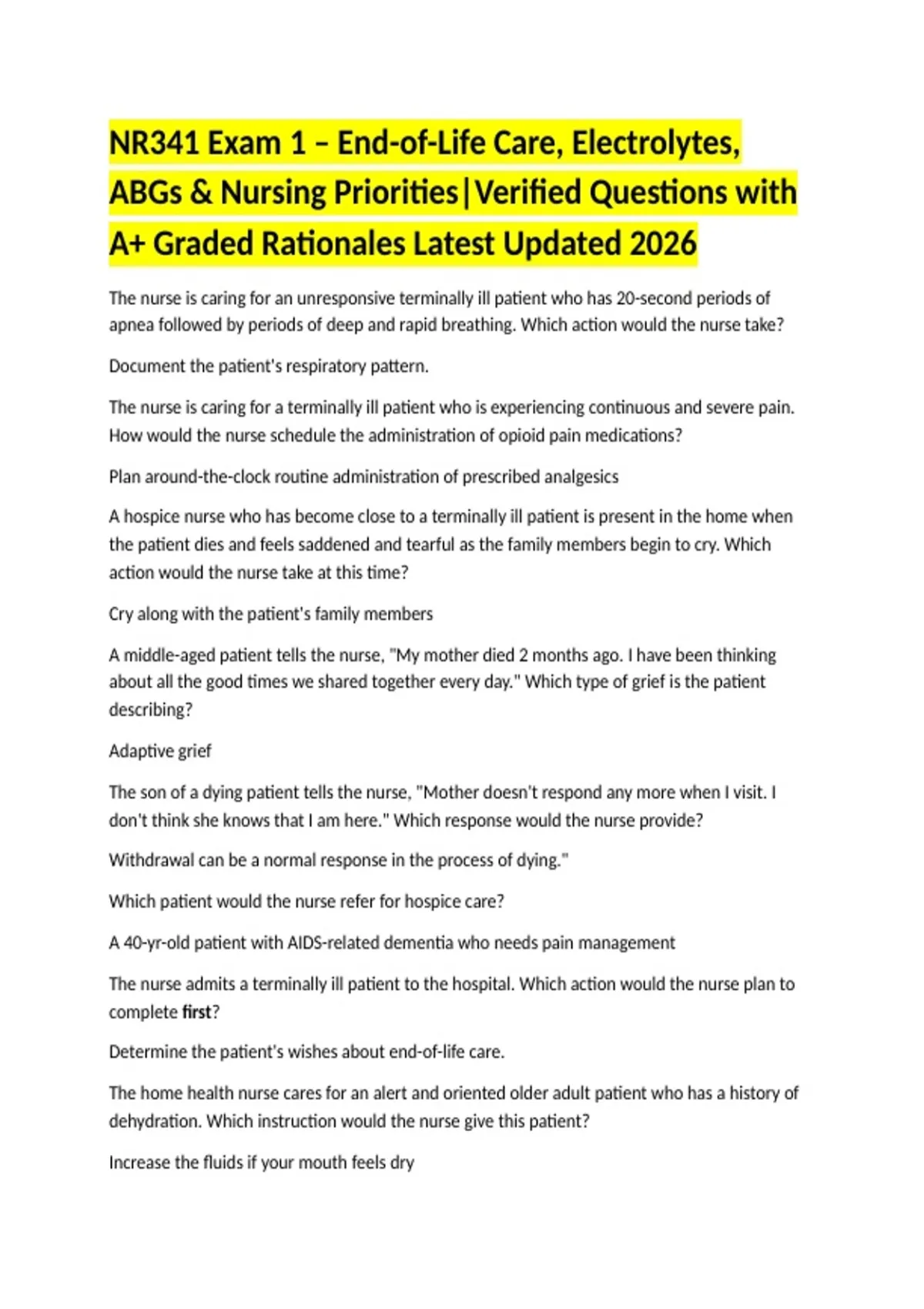 NR341 Exam 1 – End-of-Life Care, Electrolytes, ABGs & Nursing Priorities|Verified Questions with A+ Graded Rationales Latest Updated 2026