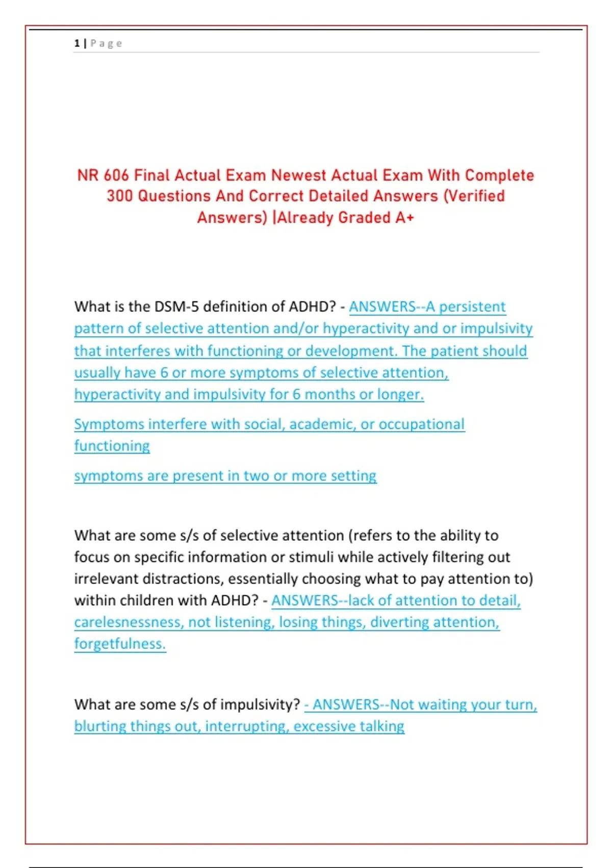 NR 606 FINAL EXAM: 300 Verified Q&A | DSM-5, ADHD, Eating Disorders & More | Graded A+