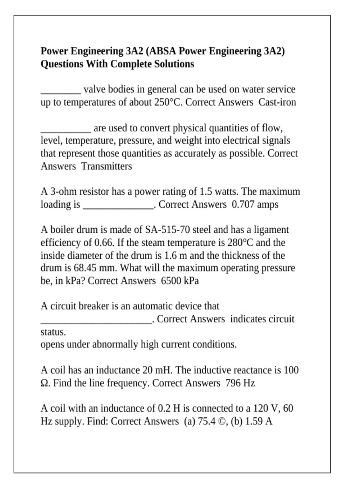 Power Engineering 3A2 (ABSA Power Engineering 3A2) Questions With Complete Solutions