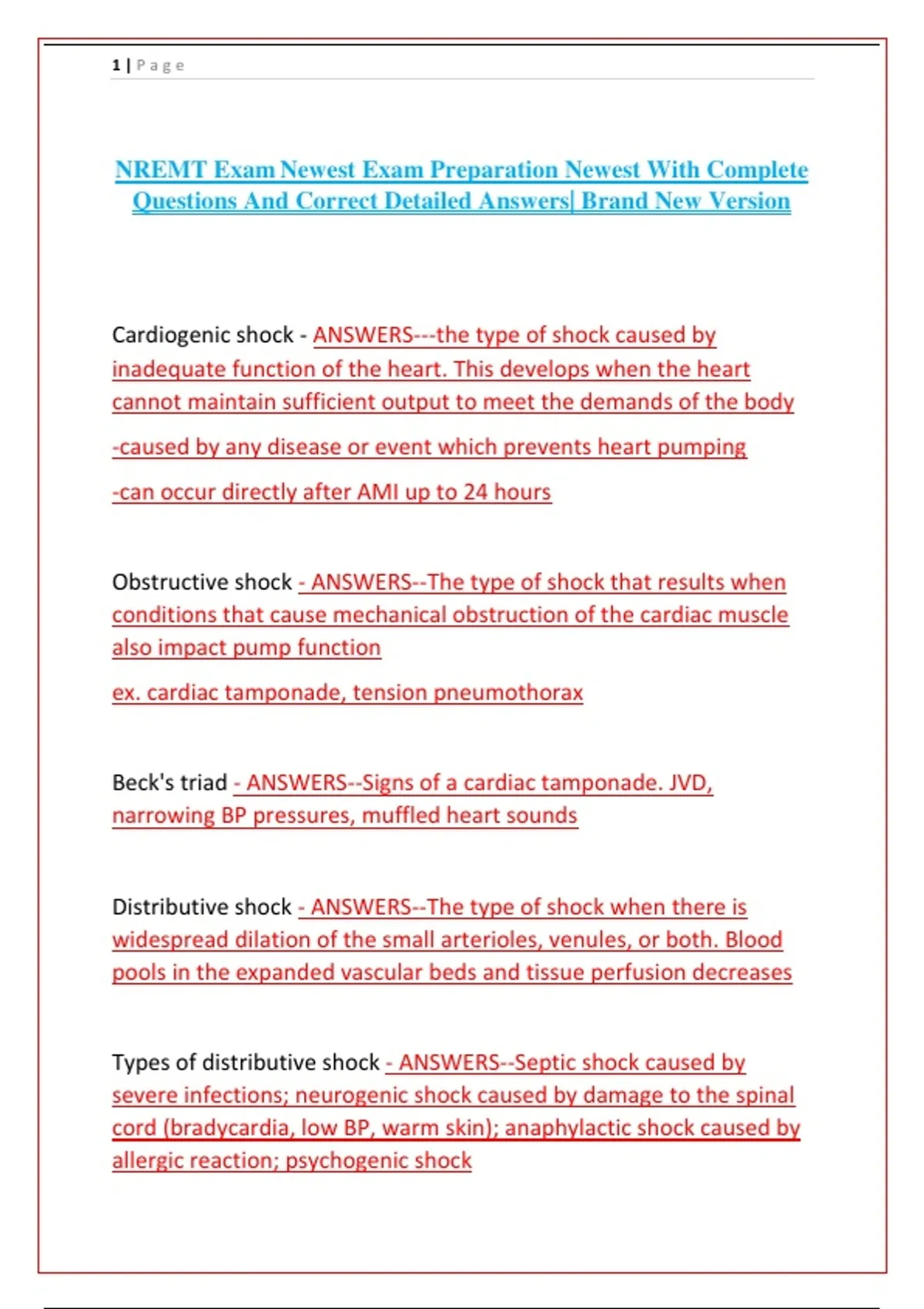 Cardiogenic shock - ANSWERS---the type of shock caused by