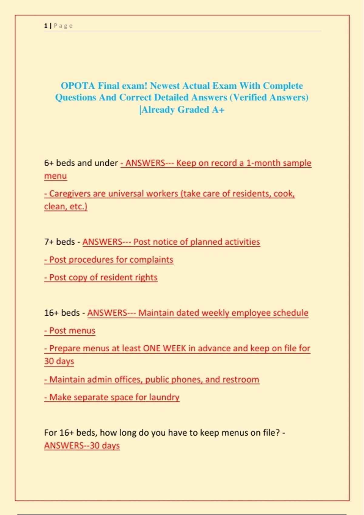 6+ beds and under - ANSWERS--- Keep on record a 1-month sample