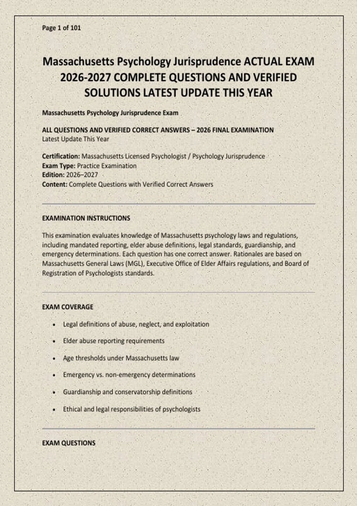 This examination evaluates knowledge of Massachusetts psychology laws and regulations,