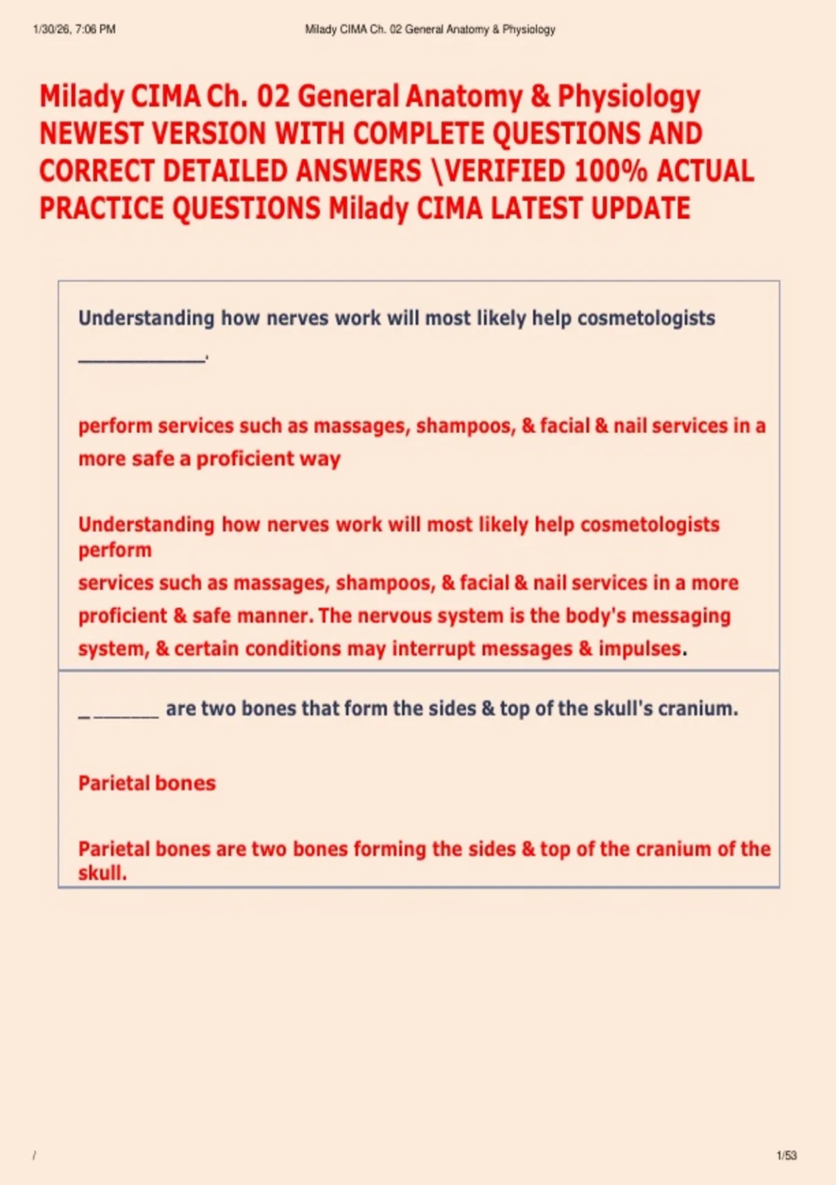 Milady CIMA Ch. 02 General Anatomy & Physiology NEWEST VERSION WITH COMPLETE QUESTIONS AND CORRECT DETAILED ANSWERS VERIFIED 100% ACTUAL PRACTICE QUESTIONS Milady CIMA LATEST UPDATE