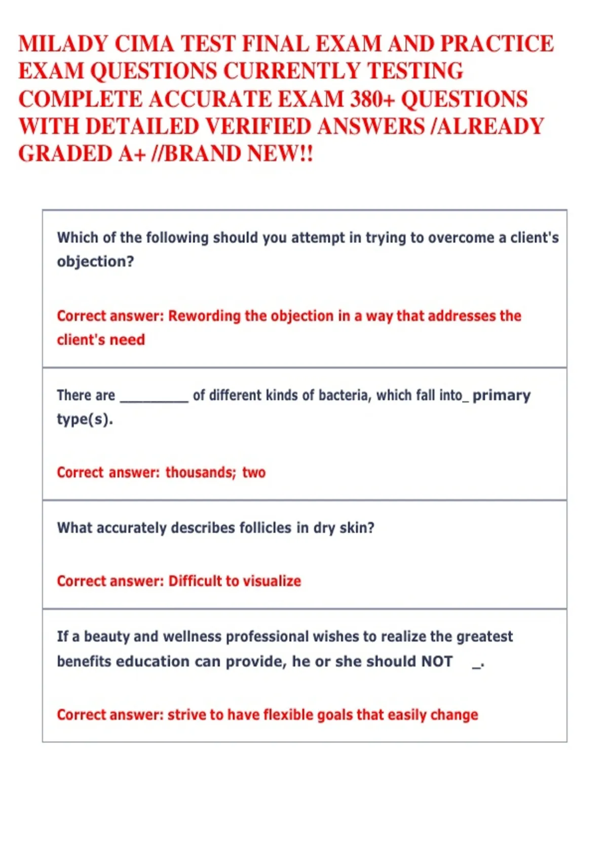 MILADY CIMA TEST FINAL EXAM AND PRACTICE EXAM QUESTIONS CURRENTLY TESTING COMPLETE ACCURATE EXAM 380+ QUESTIONS WITH DETAILED VERIFIED ANSWERS /ALREADY GRADED A+ //BRAND NEW!!