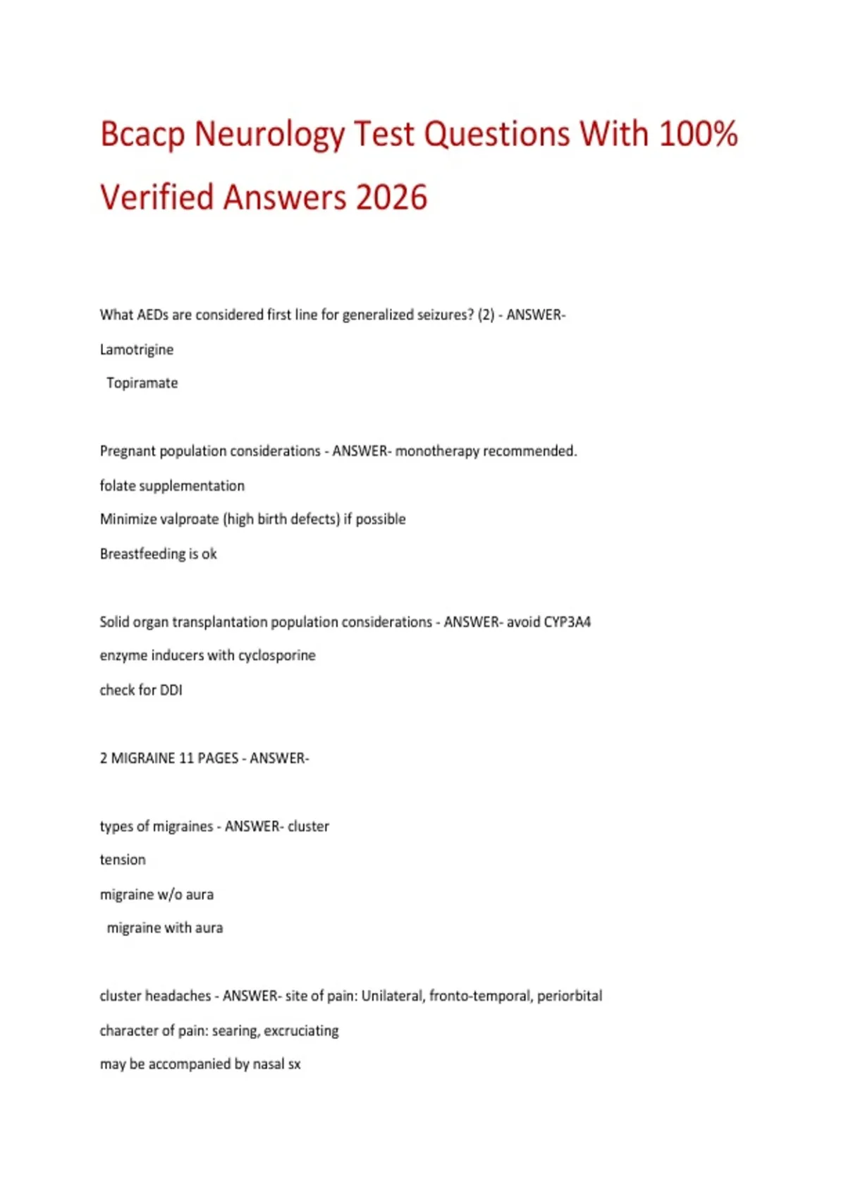 Bcacp Neurology Test Questions With 100% Verified Answers 2026 What AEDs are considered first line for generalized seizures? (2) - ANSWER- Lamotrigine Topiramate Pregnant population considerations - ANSWER- monotherapy recommended. folate supplementation Minimize valproate (high birth defects) if possible Breastfeeding is ok Solid organ transplantation population considerations - ANSWER- avoid CYP3A4 enzyme inducers with cyclosporine check for DDI 2 MIGRAINE 11 PAGES - ANSWER- types of migraines - ANSWER- cluster tension migraine w/o aura migraine with aura cluster headaches - ANSWER- site of pain: Unilateral, fronto-temporal, periorbital character of pain: searing, excruciating may be accompanied by nasal sx more common in men tension HA - ANSWER- site of pain: bilateral, frontal, occipital character: aching, tight, squeezing migraine - ANSWER- site of pain: Usually unilateral at start; may become bilateral character: Pulsatile, throbbing accompanied by: photophobia, phonophobia, hyperosmia, N/V at least 5 attacks lasting 4-72 hrs first line acute tx of cluster HA - ANSWER- triptan - intranasal or injectable forms oxygen Preventive treatment of cluster HA - ANSWER- short term: corticosteroid burst 1x/year. ergotamines long term: verapamil (gold standard). lithium, gabapentin, topiramate, valproic acid non-pharm tx of migraines - ANSWER- avoid triggers acute tx of tension type HA - ANSWER- analgesics NSAIDs combination anagesics w/ and w/o caffeine preventive tx of tension-type HA - ANSWER- TCAs SSRIs if depression pharmacological acute treatment of migraines classes (4) - ANSWER- analgesics/NSAIDs triptans ergotamines anti-emetics What are the aromatic AEDs? (7) When should they be avoided? - ANSWER- Phenytoin Carbamazepine Oxcarbazepine Eslicarbazepine Phenobarbital Lamotrigine Perampanel Cross reactivity of rash is highest among aromatics. If patient has any type of rxn to one aromatic avoid all other aromatics Anticonvulsant hypersensitivity syndrome - ANSWER- Rare, severe, delayed, multiorgan, type IV reaction Can be life-threatening 2-8 weeks after initiation Triad: fever, rash, organ involvement What AEDs are considered first line for focal seizures? (9) - ANSWER- carbamazepine gabapentin lamotrigine oxcarbazepine phenobarbital topiramate valproate lacosamide eslicarbazepine What do you need to qualify as migraine w/ aura - ANSWER- at least 1 fully reversible aura sx. Usually visual sx. may include sensory sx, motor sx. Doesn't last longer than