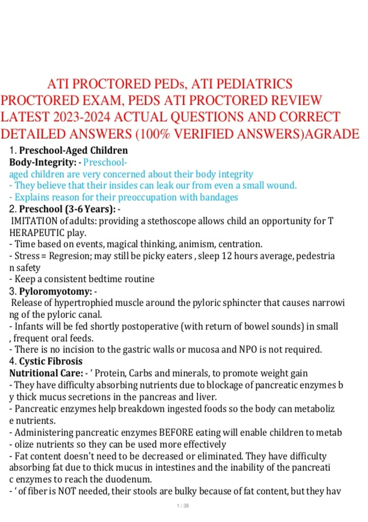 ATI PROCTORED PEDs, ATI PEDIATRICS PROCTORED EXAM, PEDS ATI PROCTORED REVIEW LATEST ACTUAL QUESTIONS AND CORRECT DETAILED ANSWERS (100% VERIFIED ANSWERS)AGRADE