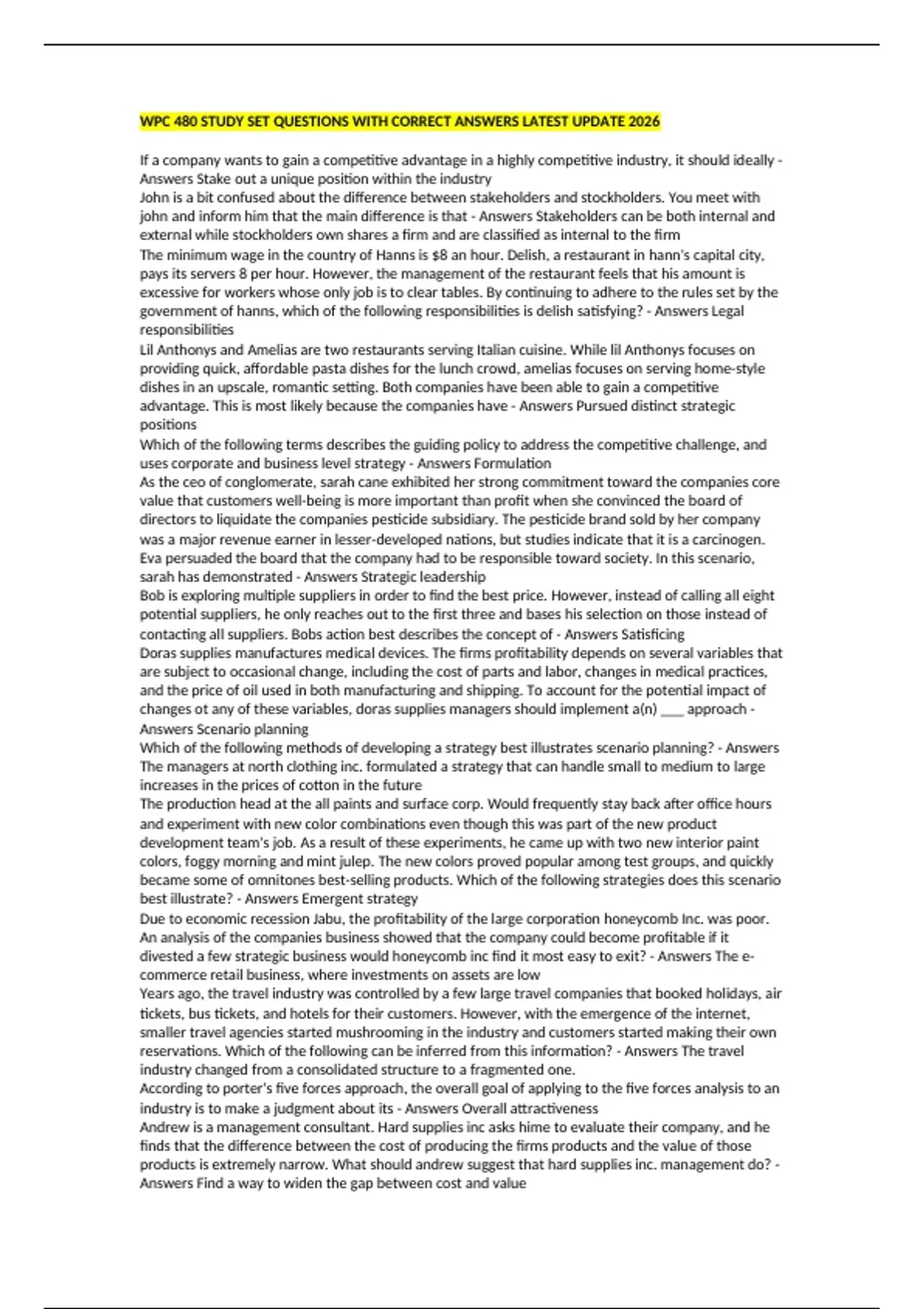 WPC 480 STUDY SET QUESTIONS WITH CORRECT ANSWERS LATEST UPDATE 2026 If a company wants to gain a competitive advantage in a highly competitive industry, it should ideally - Answers Stake out a unique position within the industry John is a bit confused about the difference between stakeholders and stockholders. You meet with john and inform him that the main difference is that - Answers Stakeholders can be both internal and external while stockholders own shares a firm and are classified as internal to the firm The minimum wage in the country of Hanns is $8 an hour. Delish, a restaurant in hann's capital city, pays its servers 8 per hour. However, the management of the restaurant feels that his amount is excessive for workers whose only job is to clear tables. By continuing to adhere to the rules set by the government of hanns, which of the following responsibilities is delish satisfying? - Answers Legal responsibilities Lil Anthonys and Amelias are two restaurants serving Italian cuisine. While lil Anthonys focuses on providing quick, affordable pasta dishes for the lunch crowd, amelias focuses on serving home-style dishes in an upscale, romantic setting. Both companies have been able to gain a competitive advantage. This is most likely because the companies have - Answers Pursued distinct strategic positions Which of the following terms describes the guiding policy to address the competitive challenge, and uses corporate and business level strategy - Answers Formulation As the ceo of conglomerate, sarah cane exhibited her strong commitment toward the companies core value that customers well-being is more important than profit when she convinced the board of directors to liquidate the companies pesticide subsidiary. The pesticide brand sold by her company was a major revenue earner in lesser-developed nations, but studies indicate that it is a carcinogen. Eva persuaded the board that the company had to be responsible toward society. In this scenario, sarah has demonstrated - Answers Strategic leadership Bob is exploring multiple suppliers in order to find the best price. However, instead of calling all eight potential suppliers, he only reaches out to the first three and bases his selection on those instead of contacting all suppliers. Bobs action best describes the concept of - Answers Satisficing Doras supplies manufactures medical devices. The firms profitability depends on several variables that are subject to occasional change, including the cost of parts and labor, changes in medical practices, and the price of oil used in both manufacturing and shipping. To account for the potential impact of changes ot any of these variables, doras supplies managers should implement a(n) ___ approach - Answers Scenario planning Which of the following methods of developing a strategy best illustrates scenario planning? - Answers The managers at north clothing inc. formulated a strategy that can handle small to medium to large increases in the prices of cotton in the future The production head at the all paints and surface corp. Would frequently stay back after office hours and experiment with new color combinations even though this was part of the new product development team's job. As a result of these experiments, he came up with two new interior paint colors, foggy morning and mint julep. The new colors proved popular among test groups, and quickly became some of omnitones best-selling products. Which of the following strategies does this scenario best illustrate? - Answers Emergent strategy Due to economic recession Jabu, the profitability of the large corporation honeycomb Inc. was poor. An analysis of the companies business showed that the company could become profitable if it divested a few strategic business would honeycomb inc find it most easy to exit? - Answers The e-commerce retail business, where investments on assets are low Years ago, the travel industry was controlled by a few large travel companies that booked holidays, air tickets, bus tickets, and hotels for their customers. However, with the emergence of the internet, smaller travel agencies started mushrooming in the industry and customers started making their own reservations. Which of the following can be inferred from this information? - Answers The travel industry changed from a consolidated structure to a fragmented one. According to porter's five forces approach, the overall goal of applying to the five forces analysis to an industry is to make a judgment about its - Answers Overall attractiveness Andrew is a management consultant. Hard supplies inc asks hime to evaluate their company, and he finds that the difference between the cost of producing the firms products and the value of those products is extremely narrow. What should andrew suggest that hard supplies inc. management do? - Answers Find a way to widen the gap between cost and value