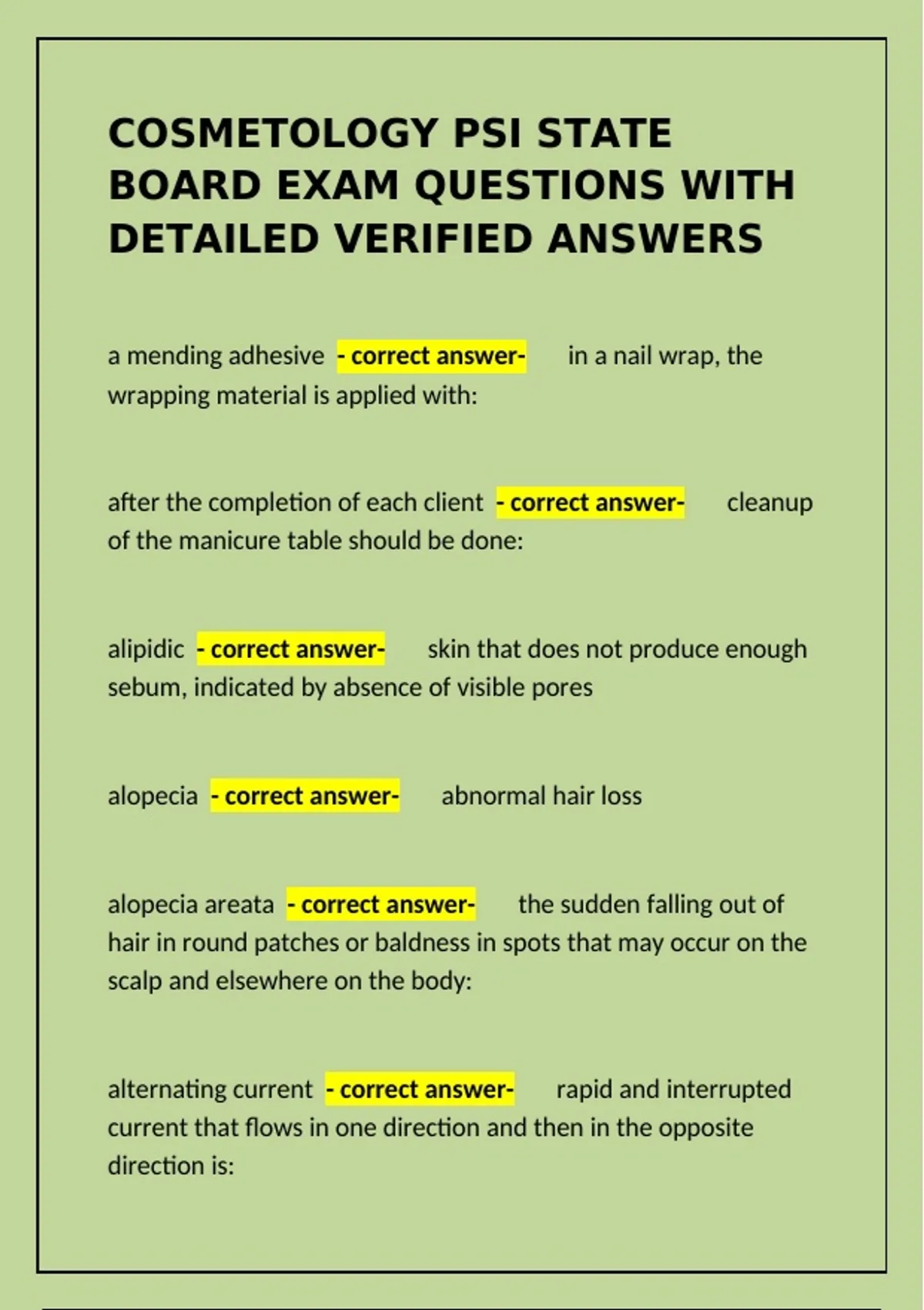 Prepare for the PSI cosmetology state board exam with this detailed review. Features verified questions and answers covering hair, skin, nails, electricity, sanitation, and practical procedures.