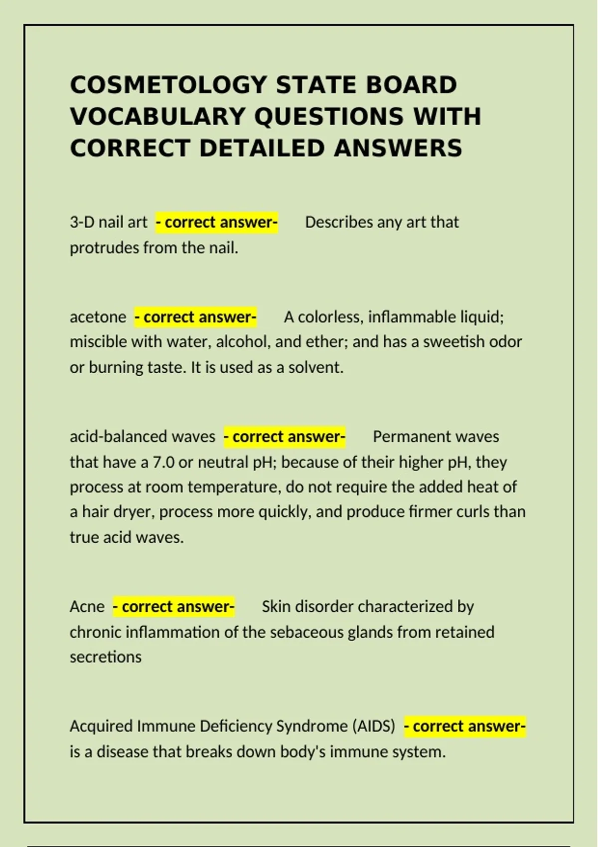 Cosmetology State Board Vocabulary questions with correct detailed answers.