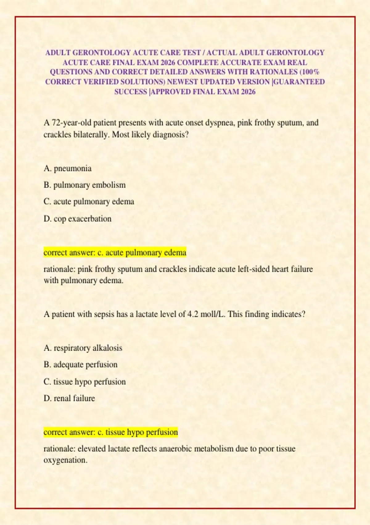 ACUTE CARE FINAL EXAM 2026 COMPLETE ACCURATE EXAM REAL