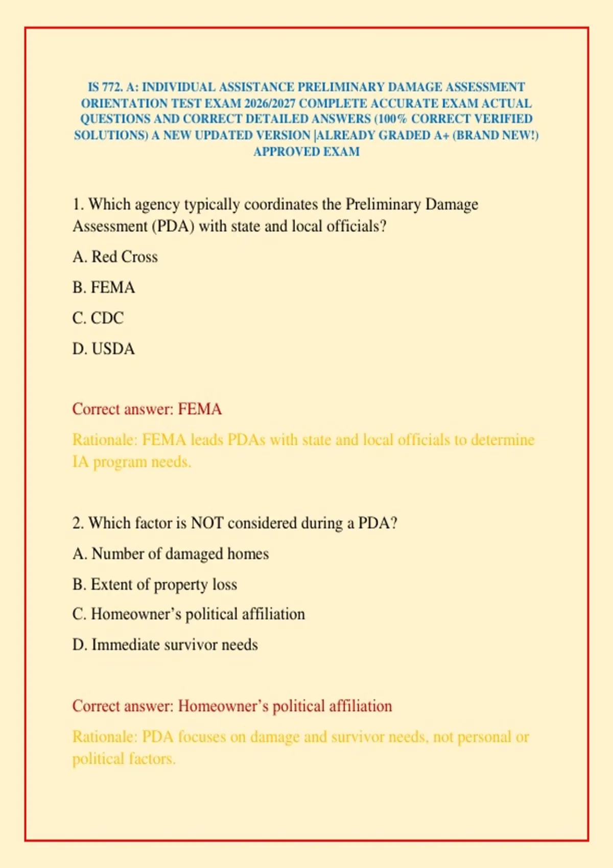 1. Which agency typically coordinates the Preliminary Damage