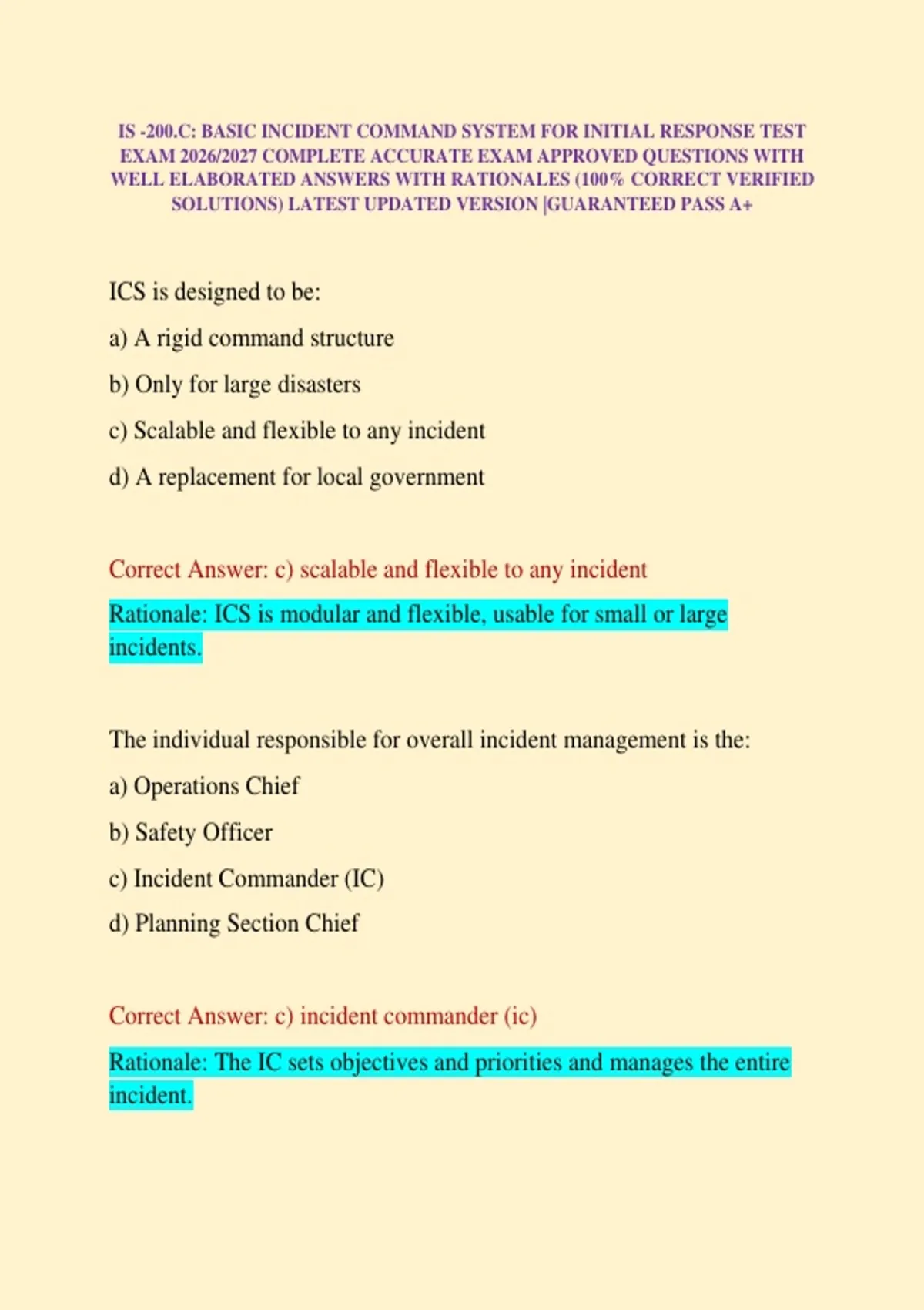 IS -200.C: BASIC INCIDENT COMMAND SYSTEM FOR INITIAL RESPONSE TEST EXAM 2026/2027 COMPLETE ACCURATE EXAM APPROVED QUESTIONS WITH WELL ELABORATED ANSWERS WITH RATIONALES (100% CORRECT VERIFIED SOLUTIONS) LATEST UPDATED VERSION |GUARANTEED PASS A+