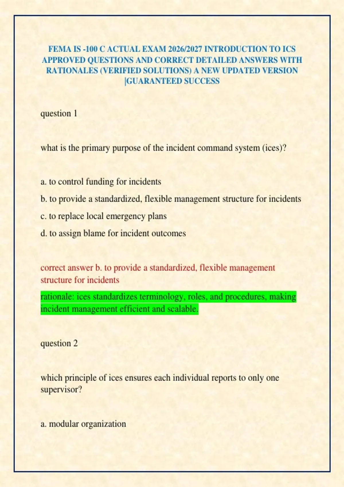 FEMA IS -100 C ACTUAL EXAM 2026/2027 INTRODUCTION TO ICS APPROVED QUESTIONS AND CORRECT DETAILED ANSWERS WITH RATIONALES (VERIFIED SOLUTIONS) A NEW UPDATED VERSION |GUARANTEED SUCCESS