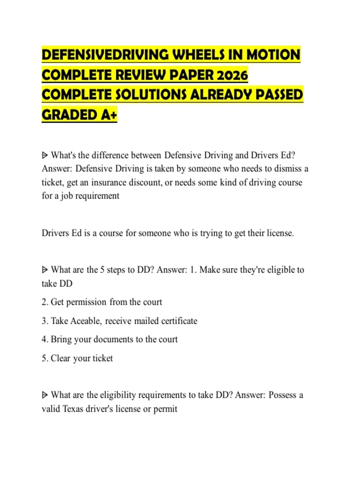 DEFENSIVEDRIVING WHEELS IN MOTION COMPLETE REVIEW PAPER 2026 COMPLETE SOLUTIONS ALREADY PASSED GRADED A+