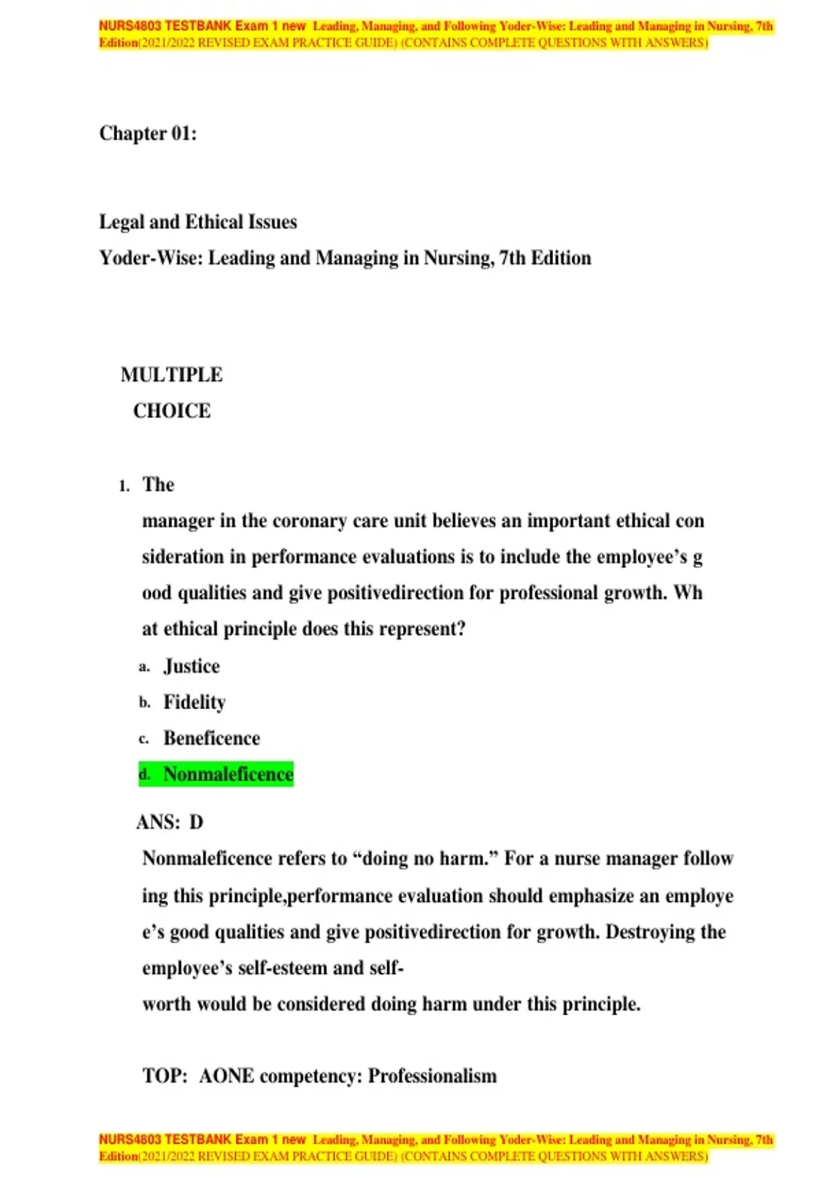 NURS4803 TESTBANK Exam 1 new Leading, Managing, and Following Yoder-Wise: Leading and Managing in Nursing, 7th