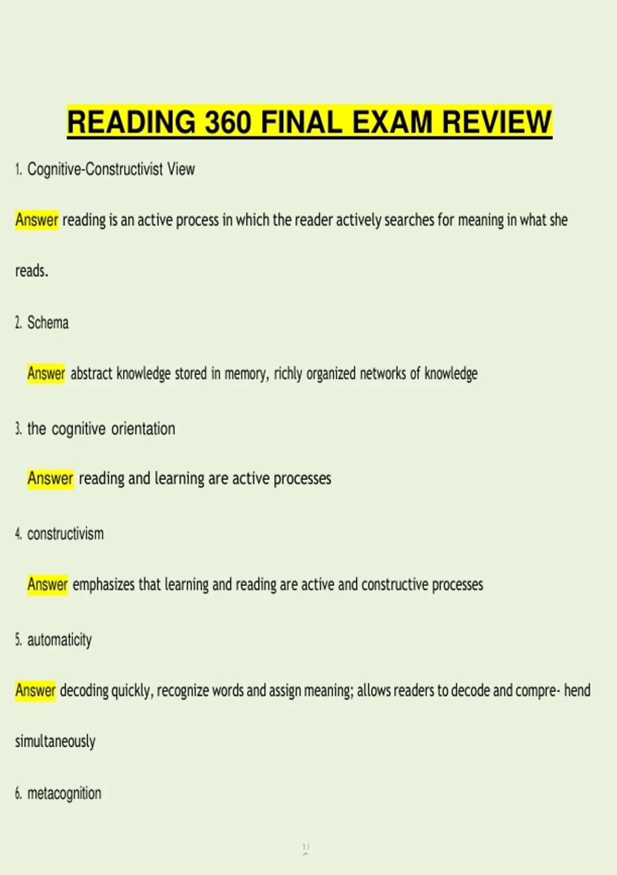 READING 360 FINAL EXAM REVIEW